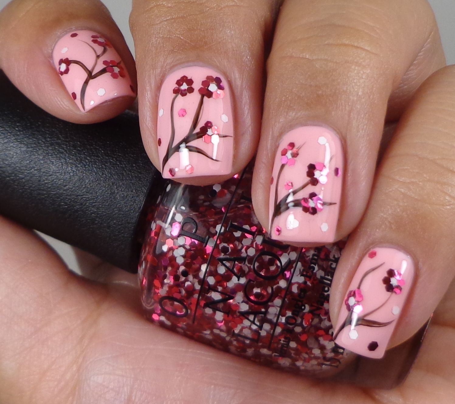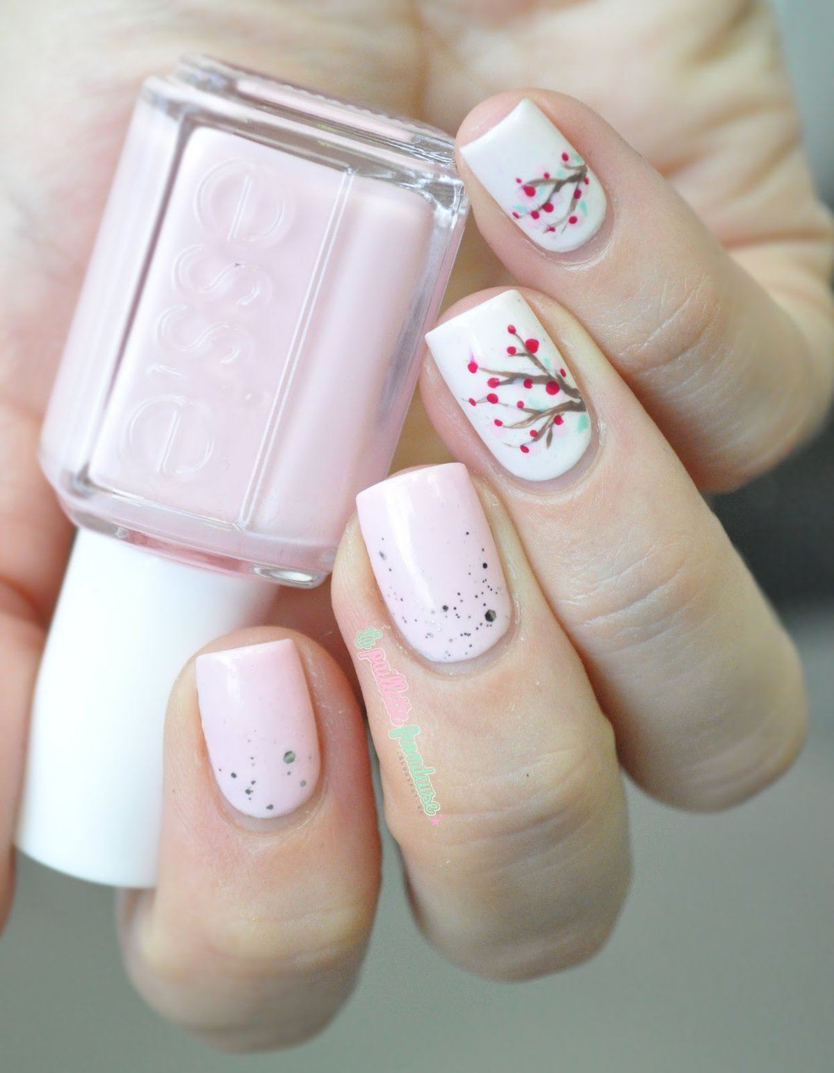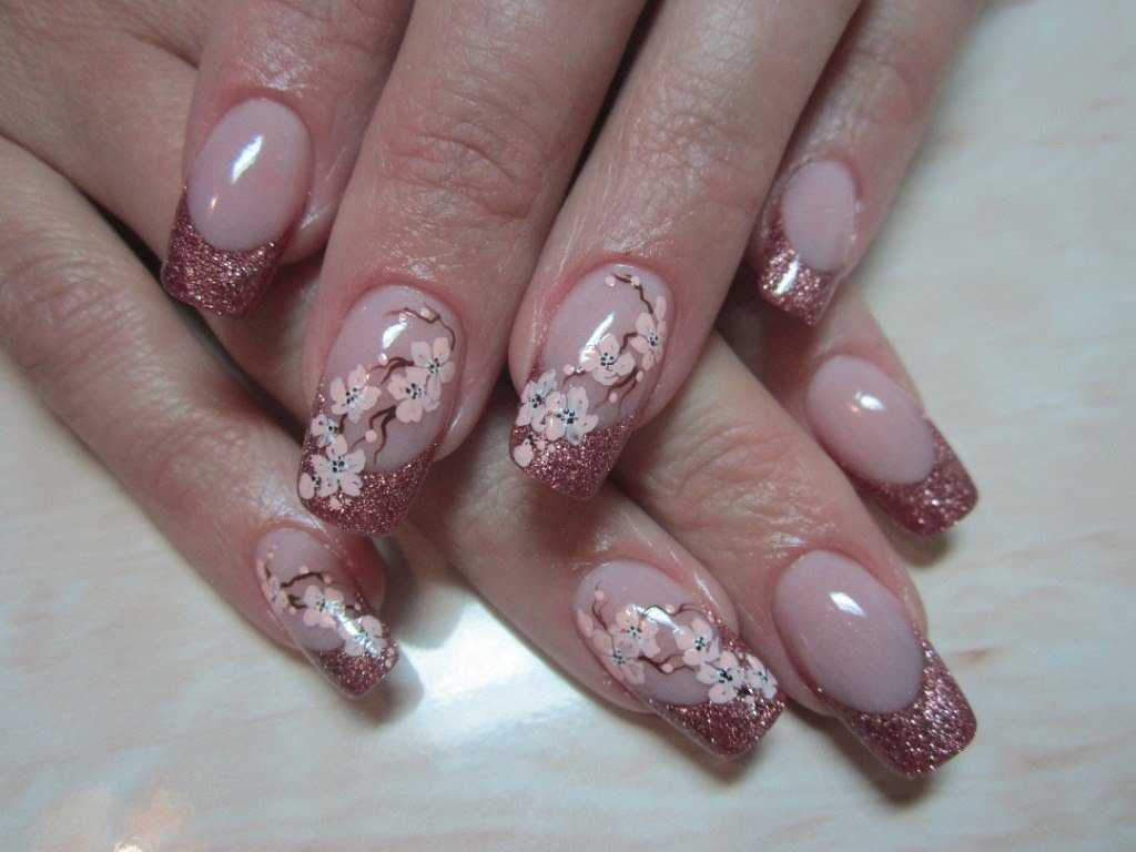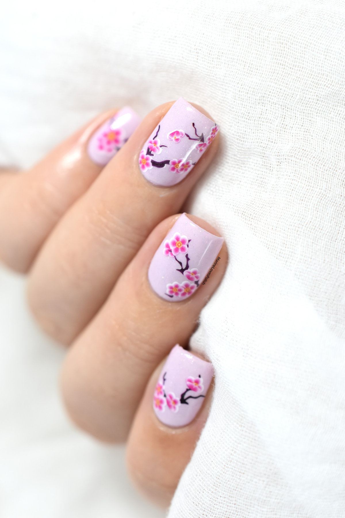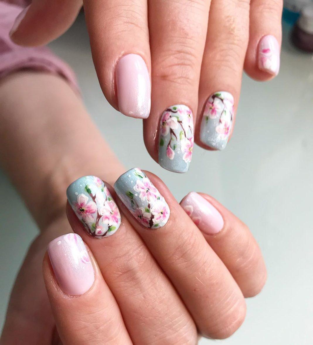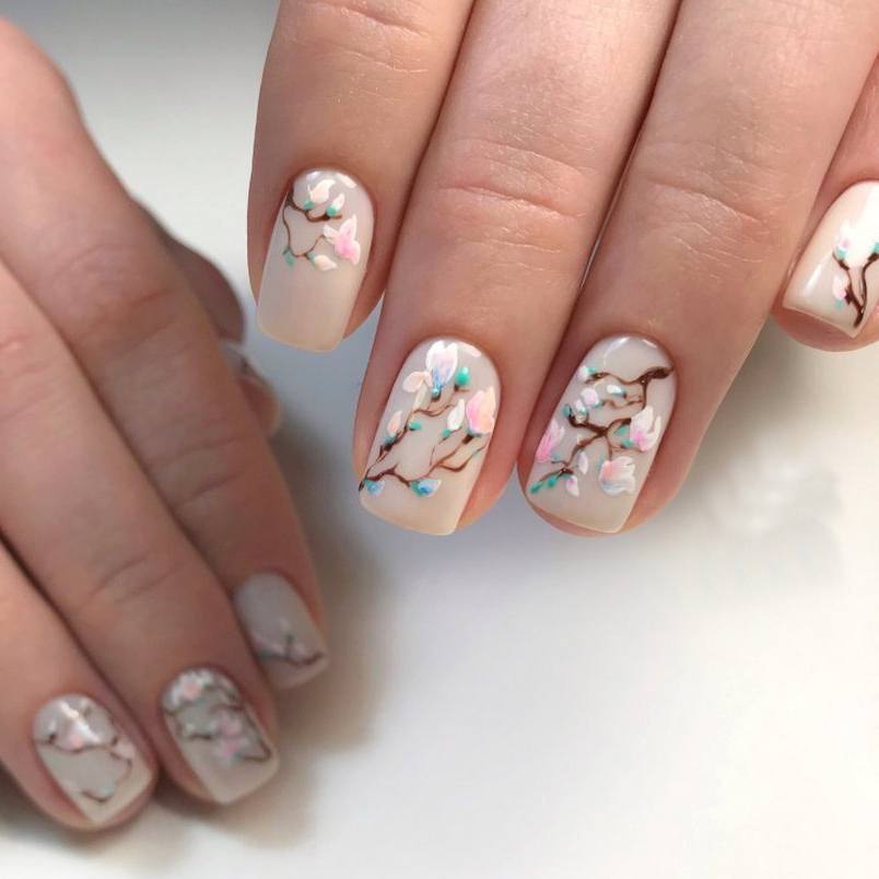 Les amateurs de manucure à la maison devraient commencer par cette option. Vous devez d’abord appliquer une couche monophonique sur tous les ongles et attendre qu’elle sèche complètement. Ensuite, appliquez les branches avec un pinceau fin et de la peinture noire. Veuillez noter qu'il est préférable que le motif ne soit placé que sur quelques ongles. Avec un pinceau légèrement plus large et de la peinture rose, appliquez l’image de fleurs sur les branches. Si vous le souhaitez, le milieu de chaque bouton peut être marqué d'une nuance légèrement plus foncée.