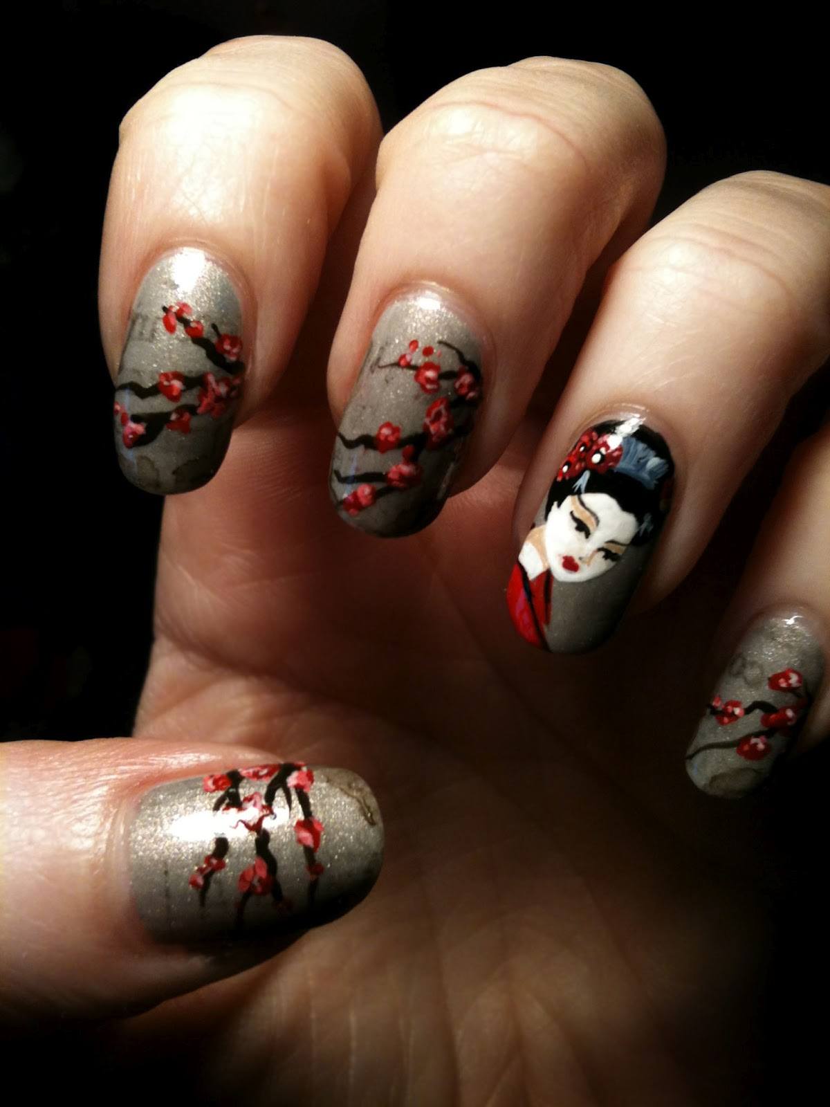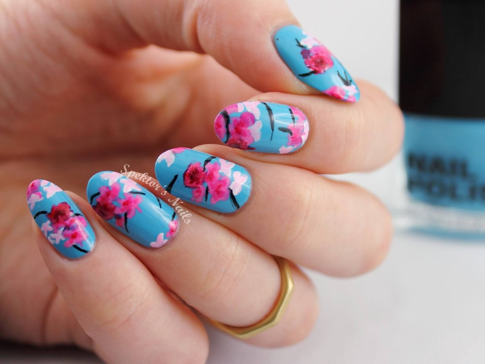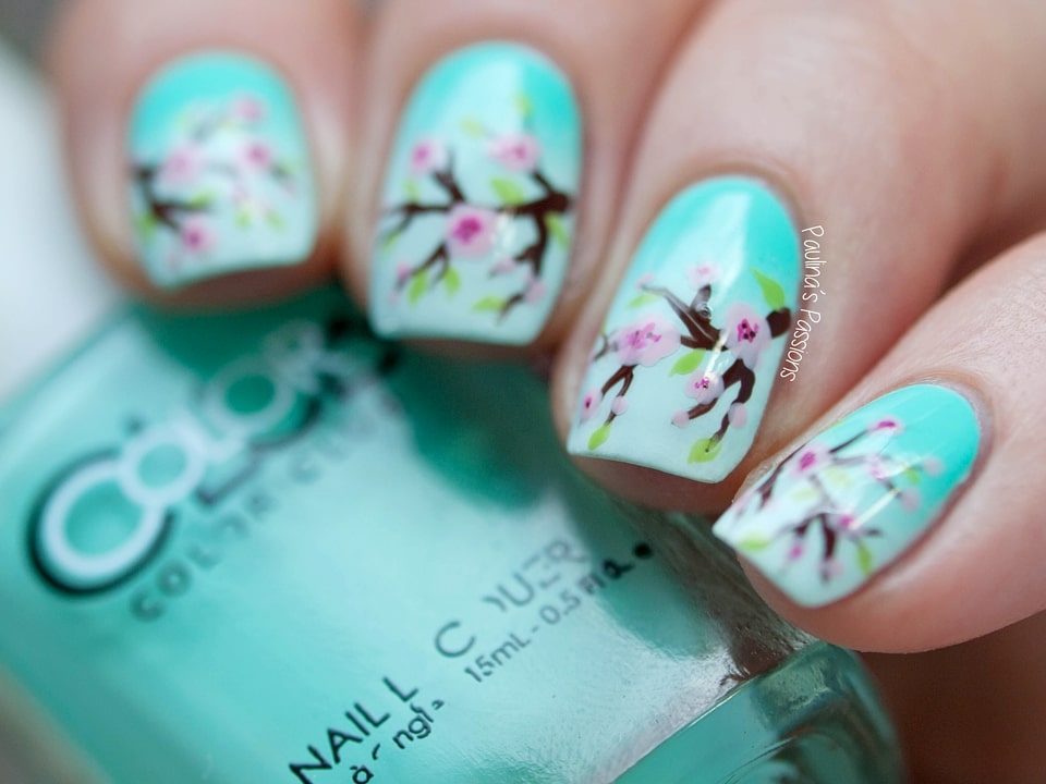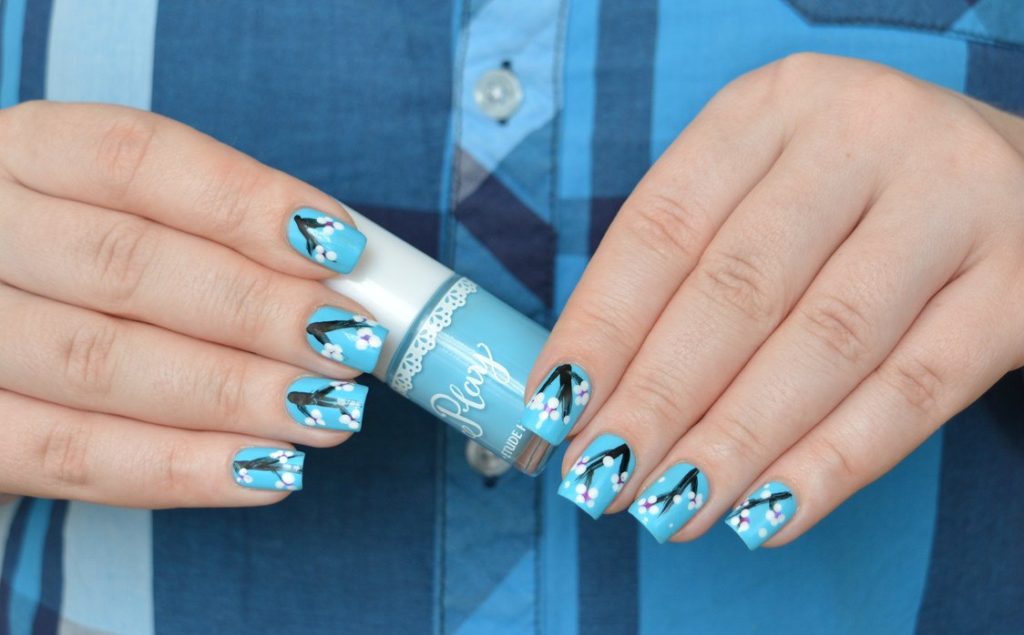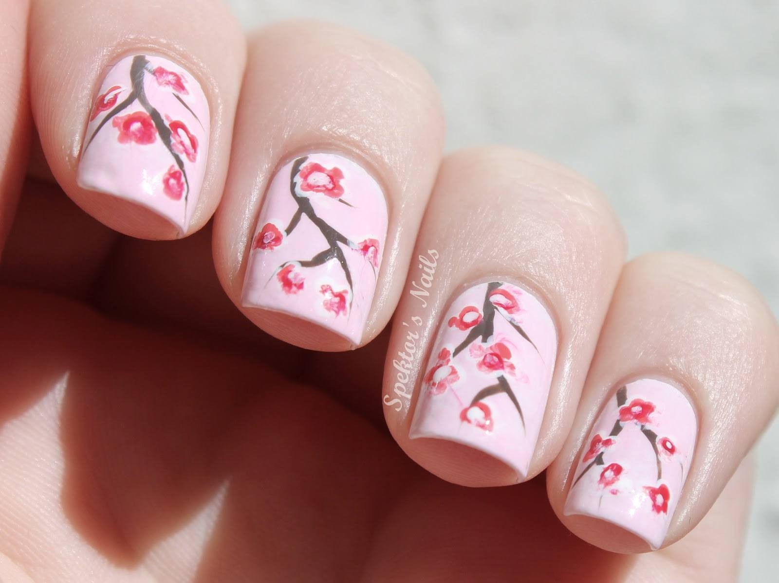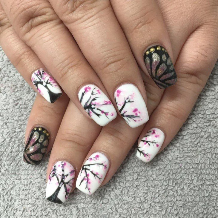 Les amateurs de manucure à la maison devraient commencer par cette option. Vous devez d’abord appliquer une couche monophonique sur tous les ongles et attendre qu’elle sèche complètement. Ensuite, appliquez les branches avec un pinceau fin et de la peinture noire. Veuillez noter qu'il est préférable que le motif ne soit placé que sur quelques ongles. Avec un pinceau légèrement plus large et de la peinture rose, appliquez l’image de fleurs sur les branches. Si vous le souhaitez, le milieu de chaque bouton peut être marqué d'une nuance légèrement plus foncée.