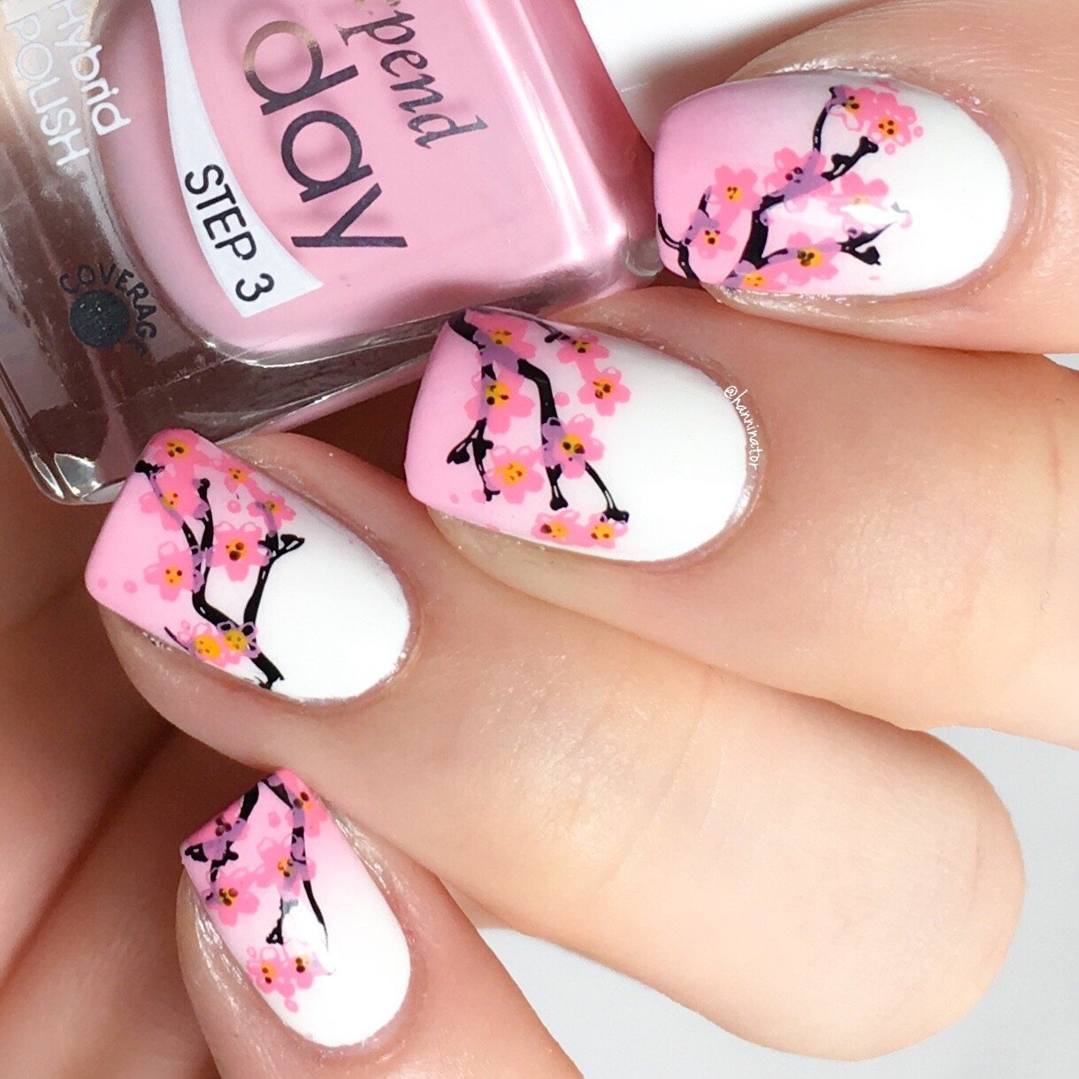 Manucure dégradée sous la forme d'une transition en douceur des nuances en elle-même est incroyablement belle. Et peu importe qu’il y ait des couleurs vives ou pastel. L'important est qu'elles se marient bien avec le jeu de couleurs que vous avez sélectionné pour le motif sakura. À propos, une telle manucure est particulièrement populaire auprès des vrais fashionistas.