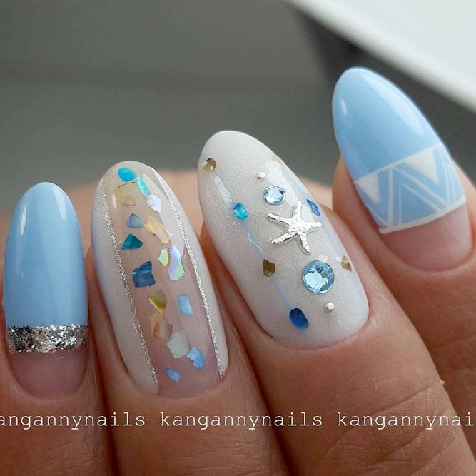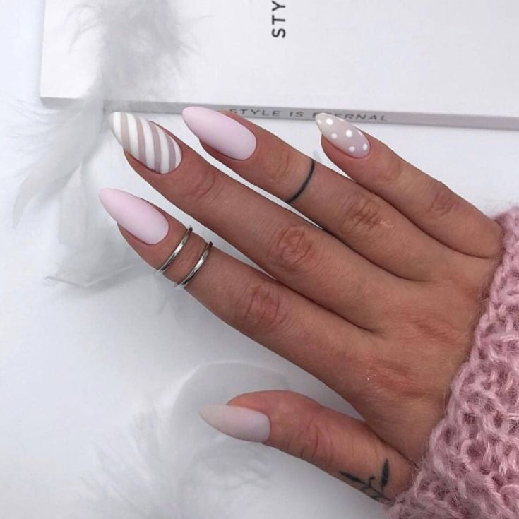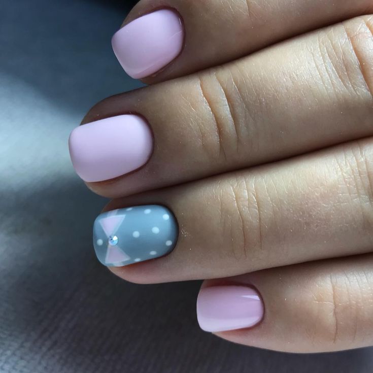 Une manucure à pois est parfaitement combinée avec des rayures et des cœurs. Cela crée un ongle chic pour créer un look de tous les jours et de fête. Cette conception de manucure est douce et romantique. En outre, la combinaison de points et de rayures convient parfaitement à une manucure de style plage ou mer. Une telle combinaison est possible dans le style du minimalisme. Mais avec l’ajout de strass et de pierres, la manucure prend un aspect festif.