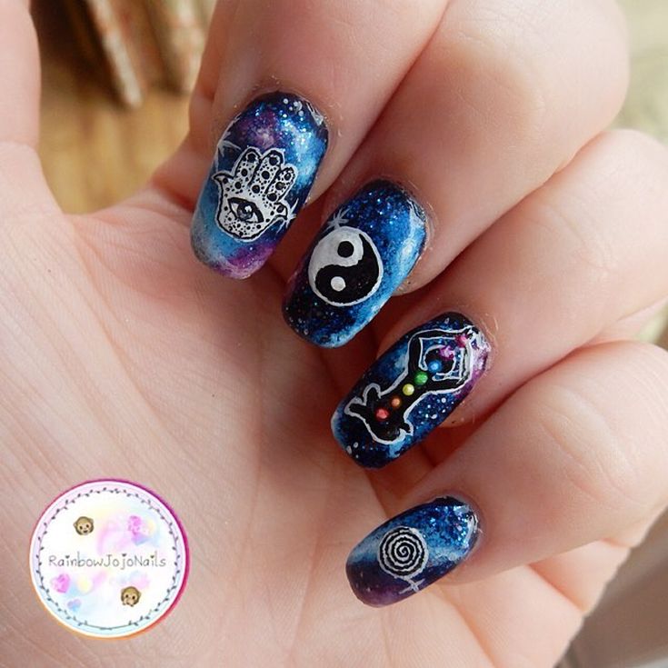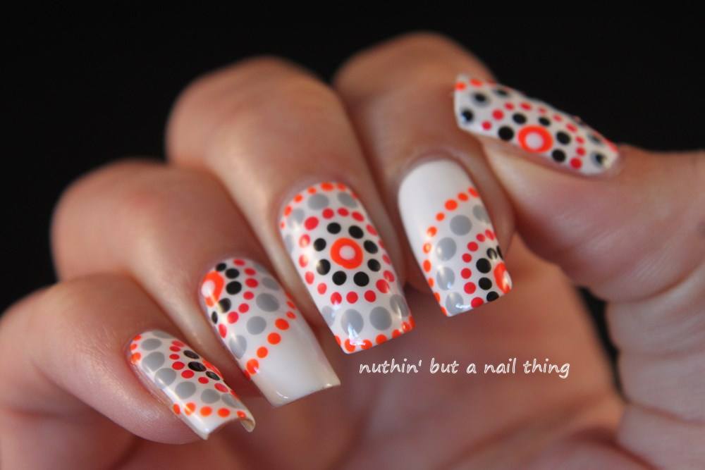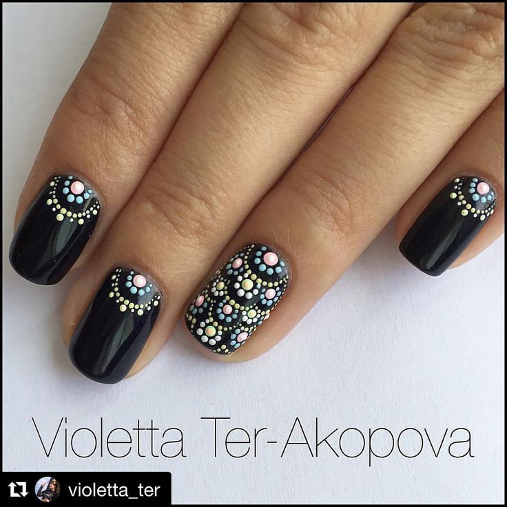 Manucure en pointillé avec un design et des motifs complexes.