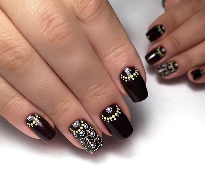Pour les manucures de printemps et d’été, une conception à pois multicolores est parfaite. Dans un tel nail art, il peut y avoir des points multicolores ou une base faite de différentes nuances. La manucure de style ombré, complétée par des points, sera une merveilleuse découverte pour la création de manucures de printemps et d’été. Une palette sombre attrayante séduira par la profondeur, le chic et la sophistication des options de conception des ongles pour une saison plus fraîche.