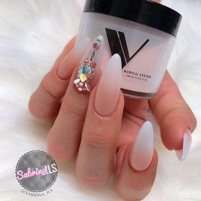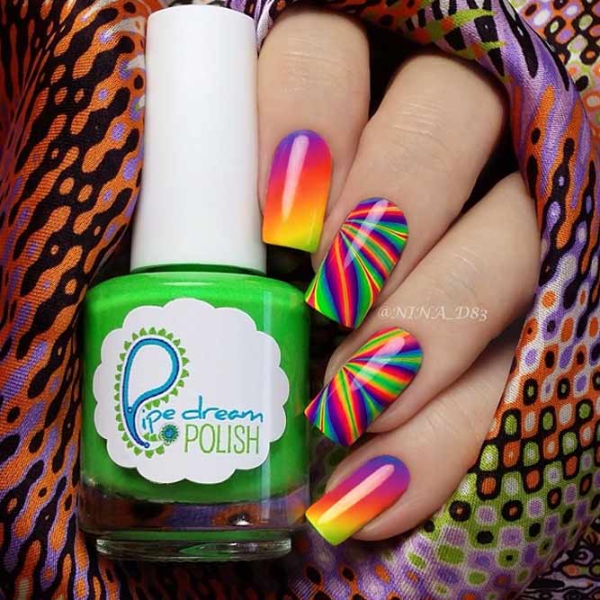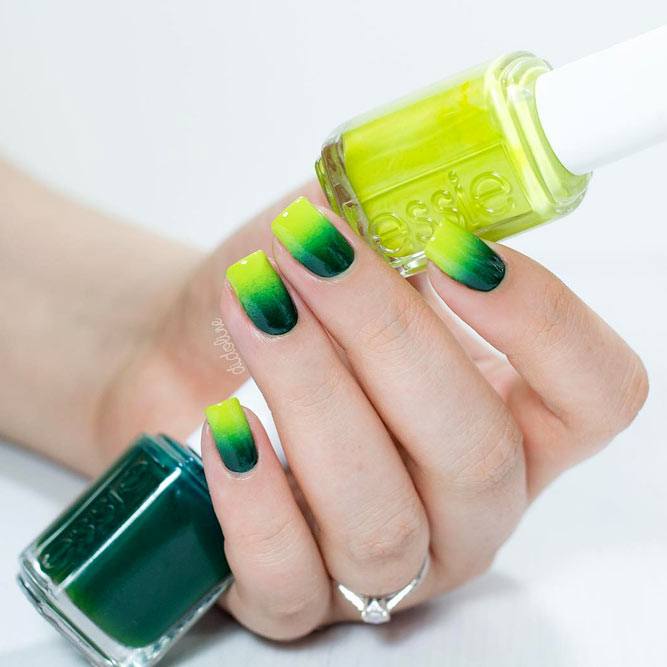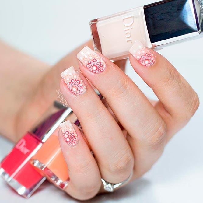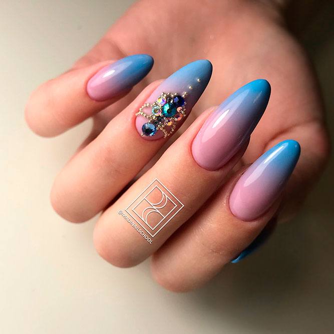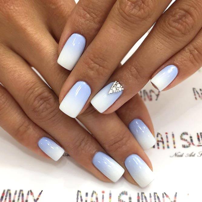 Ombre semble sur les ongles très brillants et attrayants. Ce type de nail art est le plus souvent réalisé en été. Pour réaliser une manucure aussi simple mais très élégante, vous aurez besoin de deux fleurs ou plus et d'un morceau d'éponge. Sur les ongles préparés, appliquez la base et séchez à la lampe à ultraviolets pendant 2 minutes. Maintenant, couvrez vos doigts avec du blanc. Nous passons ensuite au dégradé: appliquez les couleurs souhaitées sur l’éponge de manière à ce que la transition se fasse en douceur, imbibez chaque ongle d’une éponge (ne pressez pas l’éponge de manière à ne pas laisser de limites nettes). À la fin, couvrez la manucure avec un dessus et séchez-la.