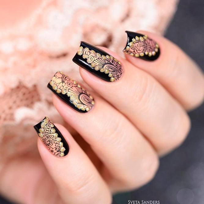 Manucure dentelle a l'air très gracieux, luxueux et belle sur les ongles. Pour l'exécuter, nous avons besoin d'un curseur régulier. Avant de commencer à effectuer une manucure, nettoyez les ongles et coupez la cuticule.Maintenant, appliquez la base et séchez sous une lampe à ultraviolets. Pour transférer la photo du curseur, utilisez une impression spéciale. Appliquez un peu de vernis sur le curseur et retirez les résidus, puis imprimez la photo sur l’impression et placez-la sur le clou. Pour que la manucure ait l’air moins provocante, il n’est pas nécessaire d’appliquer de la dentelle sur tous les ongles, il est préférable de masquer un ou deux doigts. La base des ongles peut être transparente, et afin de donner à l'ongle son originalité, rendez-la rouge ou rose. Si vous voulez un design plus lumineux, faites de la dentelle orange, violette ou blanche.