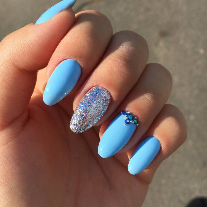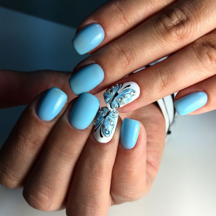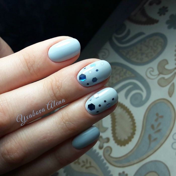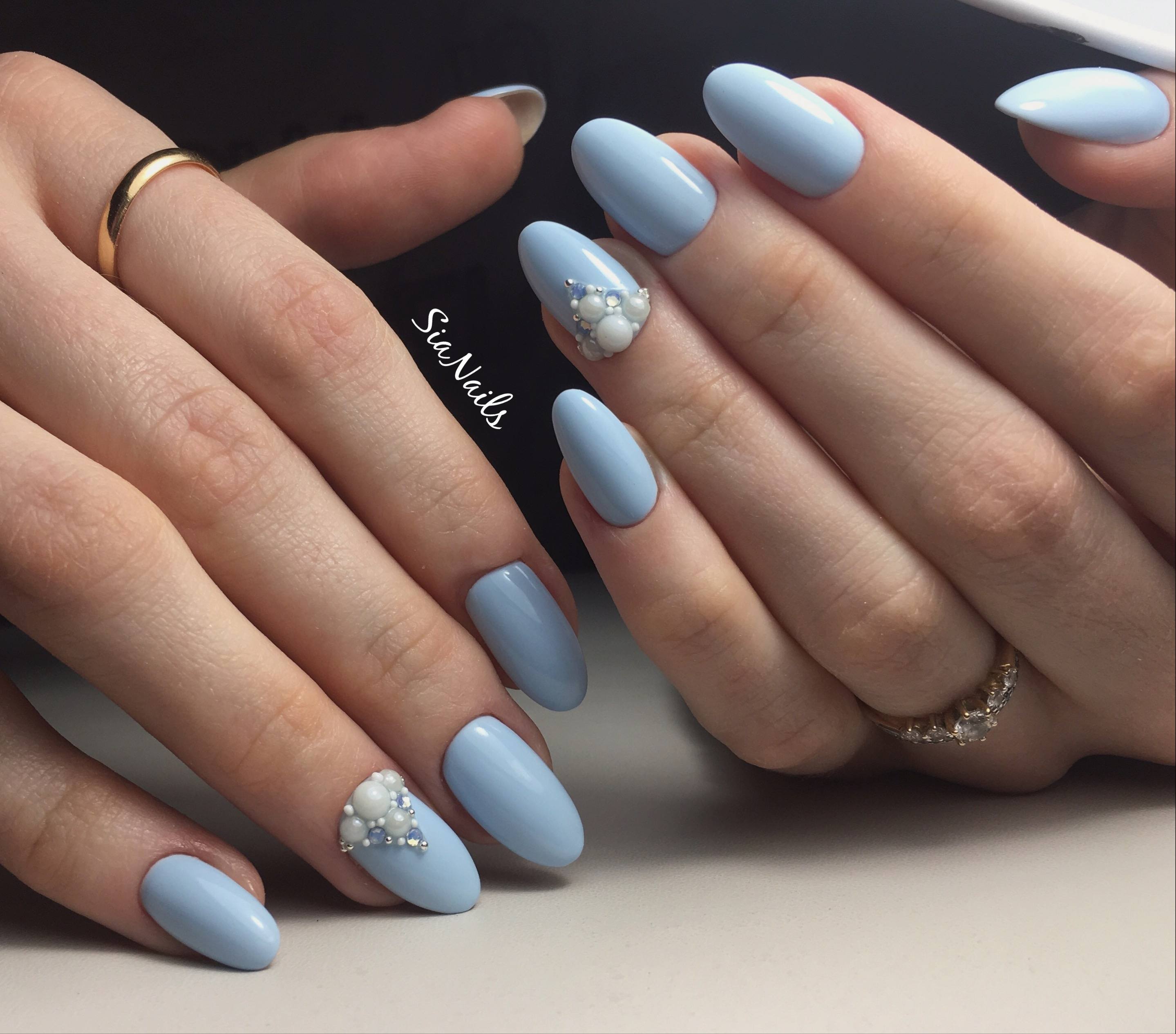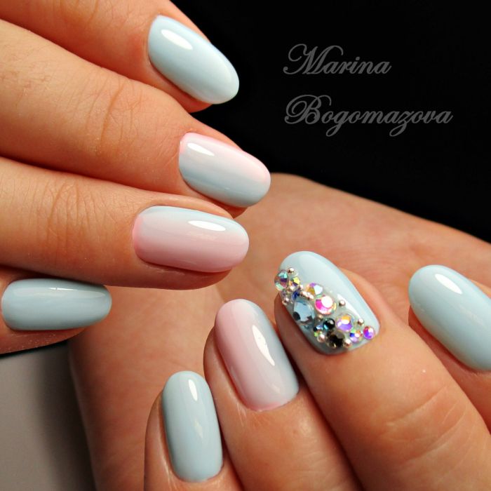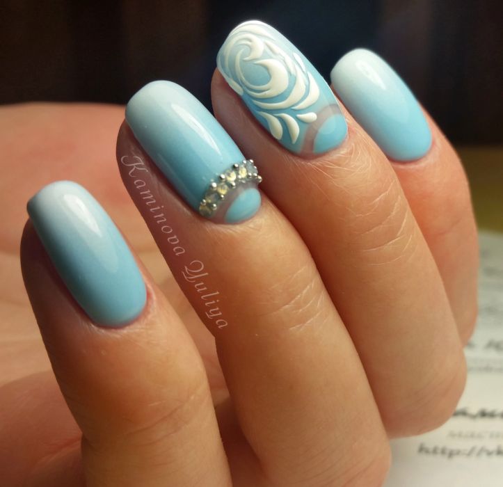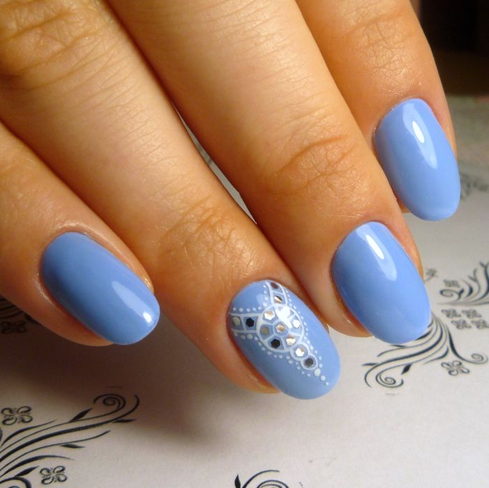 Puisque la couleur bleue elle-même est très délicate et calme, elle est souvent choisie pour un revêtement monophonique. Si vous le souhaitez, il peut être complété par diverses perles et strass pour rendre le dessin un peu plus spectaculaire.