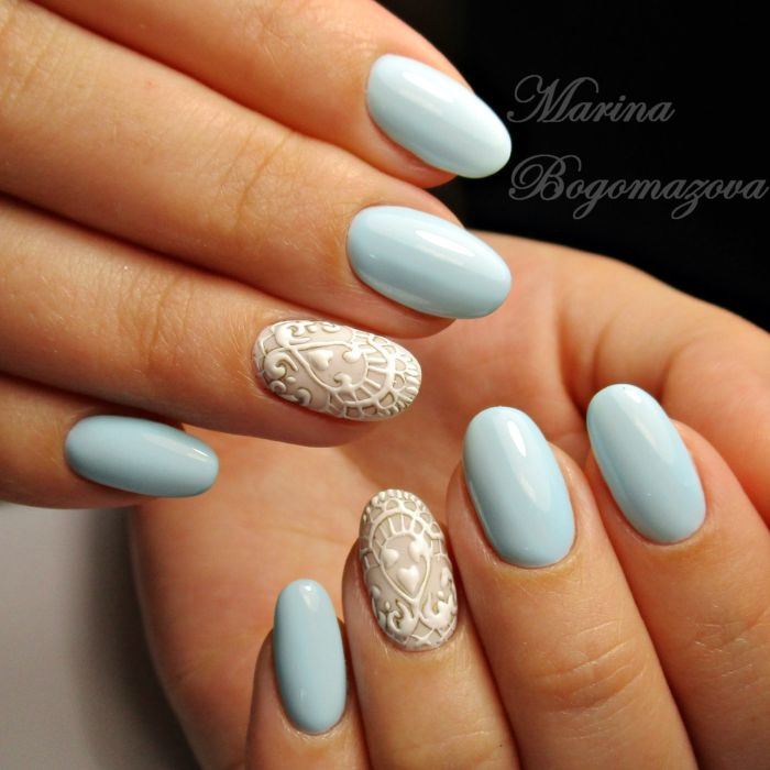En passant, beaucoup de filles choisissent une teinte bleue de vernis pour une manucure de mariage. C'est une excellente alternative au français classique. En outre, une telle solution sera particulièrement belle si de petits détails de la même teinte sont présents dans l'image. Par exemple, des boucles d'oreilles ou des éléments décoratifs dans la coiffure.