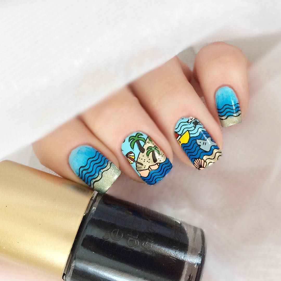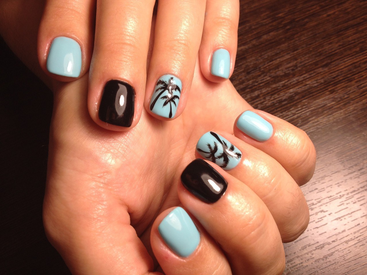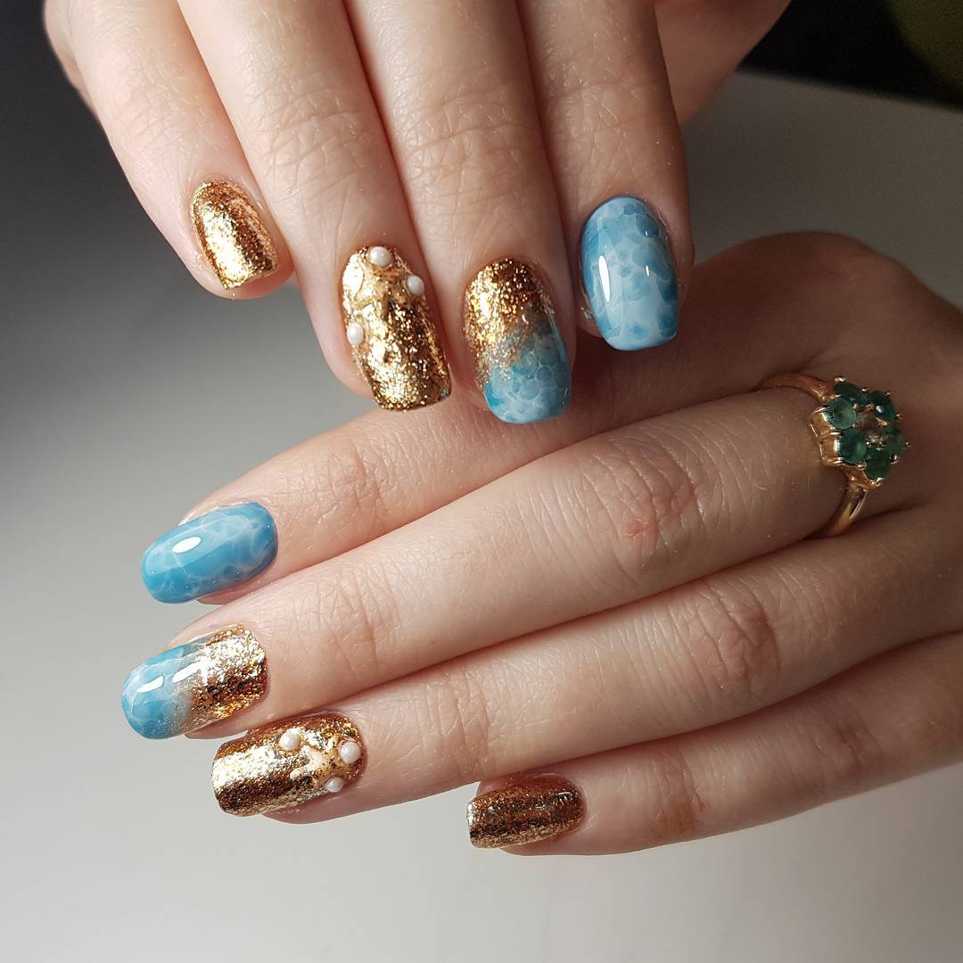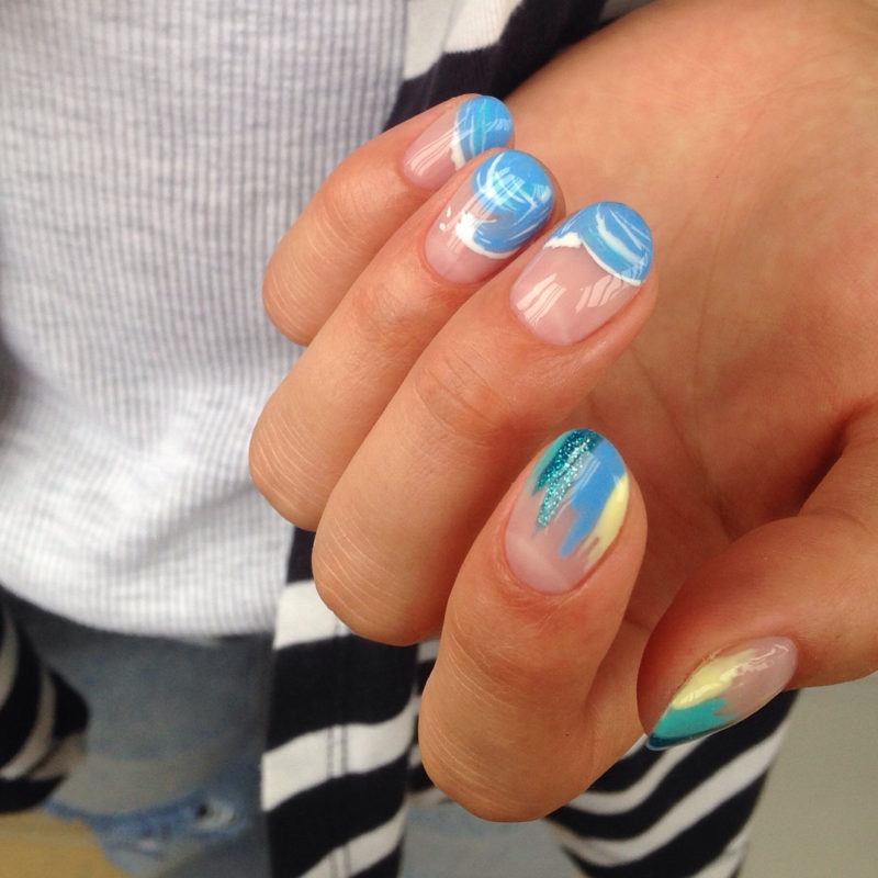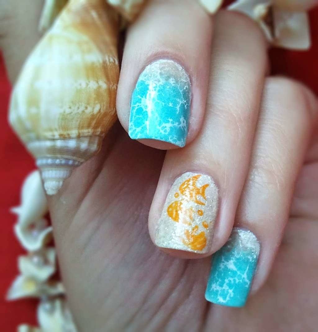 Frottez, scotch, conception dans le style de "verre brisé", ainsi que d'autres éléments de feuille - une belle décoration pour l'été. Ces détails transformeront même un simple revêtement monophonique. Par conséquent, pour des vacances, vous pouvez les choisir en toute sécurité.