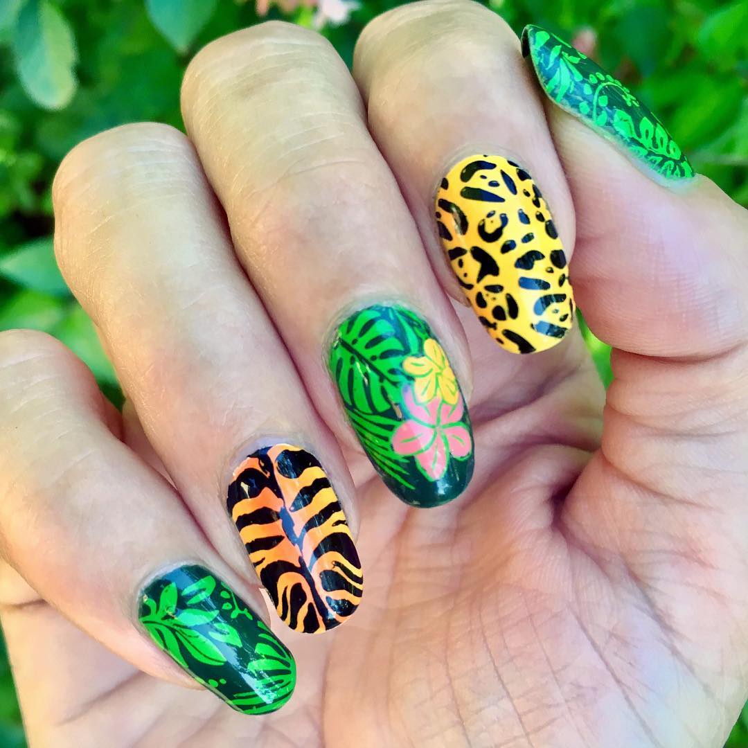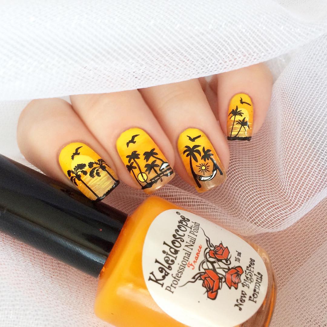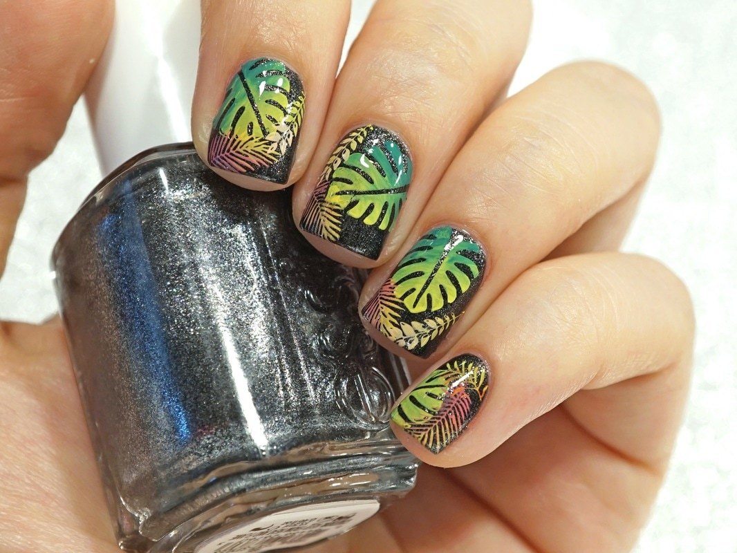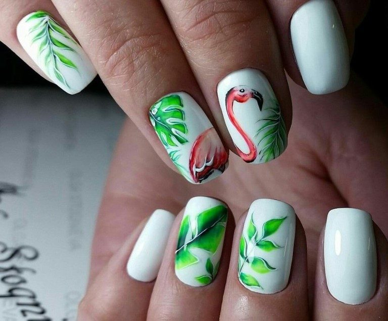Le véritable succès de l'été est un motif tropical brillant. Il est utilisé littéralement partout, depuis la conception de vêtements, d’accessoires et jusqu’à la manucure. Le grand feuillage vert est particulièrement impressionnant lorsqu'il est combiné à des teintes de vernis éclatantes. Par exemple, sur un revêtement jaune ou rose. En outre, il est souvent associé à un dessin d’ongle noir et blanc. En plus de la conception, vous pouvez créer une image de fruits ou d'habitants de la mer.