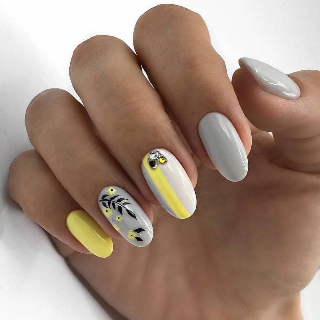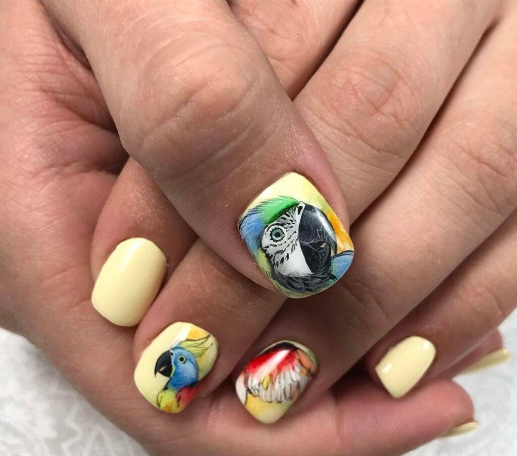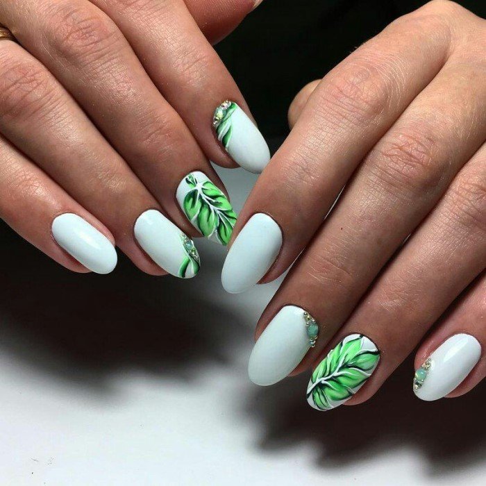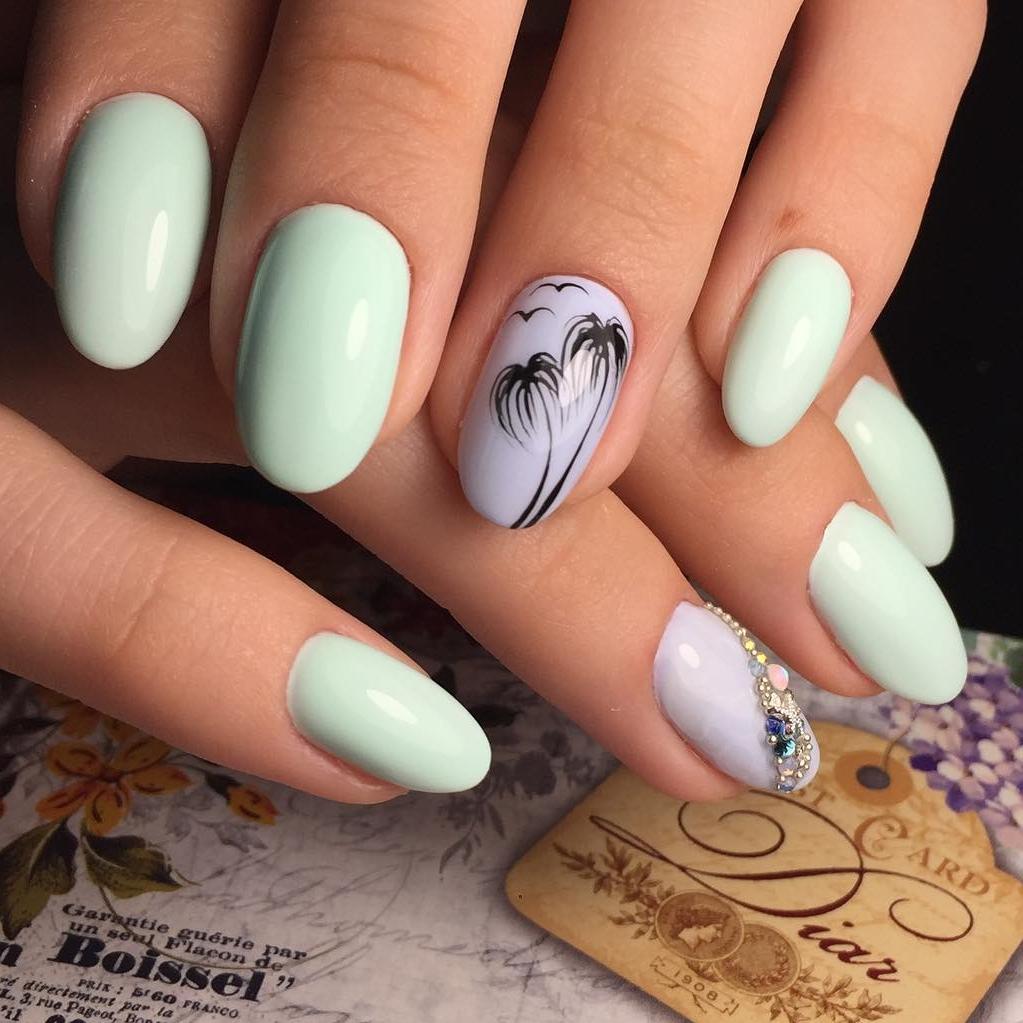 Le véritable succès de l'été est un motif tropical brillant. Il est utilisé littéralement partout, depuis la conception de vêtements, d’accessoires et jusqu’à la manucure. Le grand feuillage vert est particulièrement impressionnant lorsqu'il est combiné à des teintes de vernis éclatantes. Par exemple, sur un revêtement jaune ou rose. En outre, il est souvent associé à un dessin d’ongle noir et blanc. En plus de la conception, vous pouvez créer une image de fruits ou d'habitants de la mer.