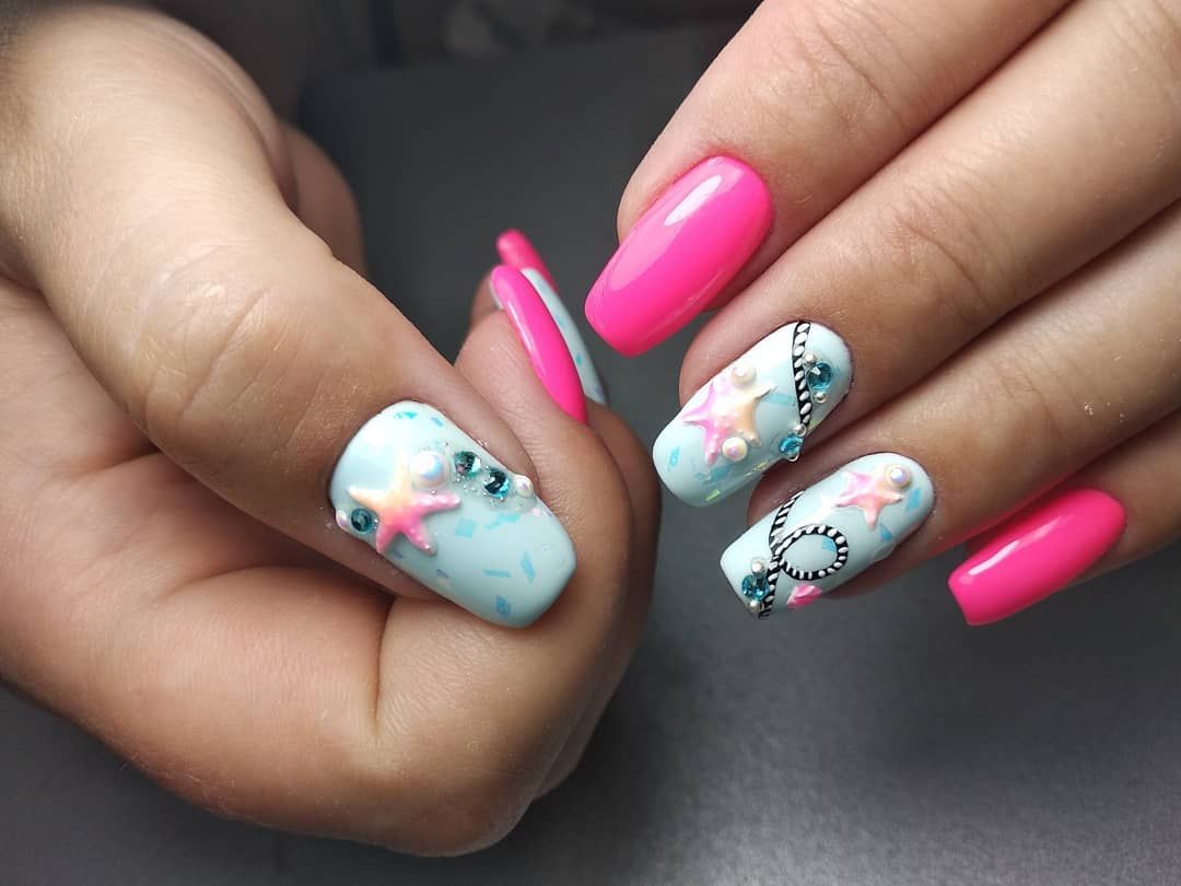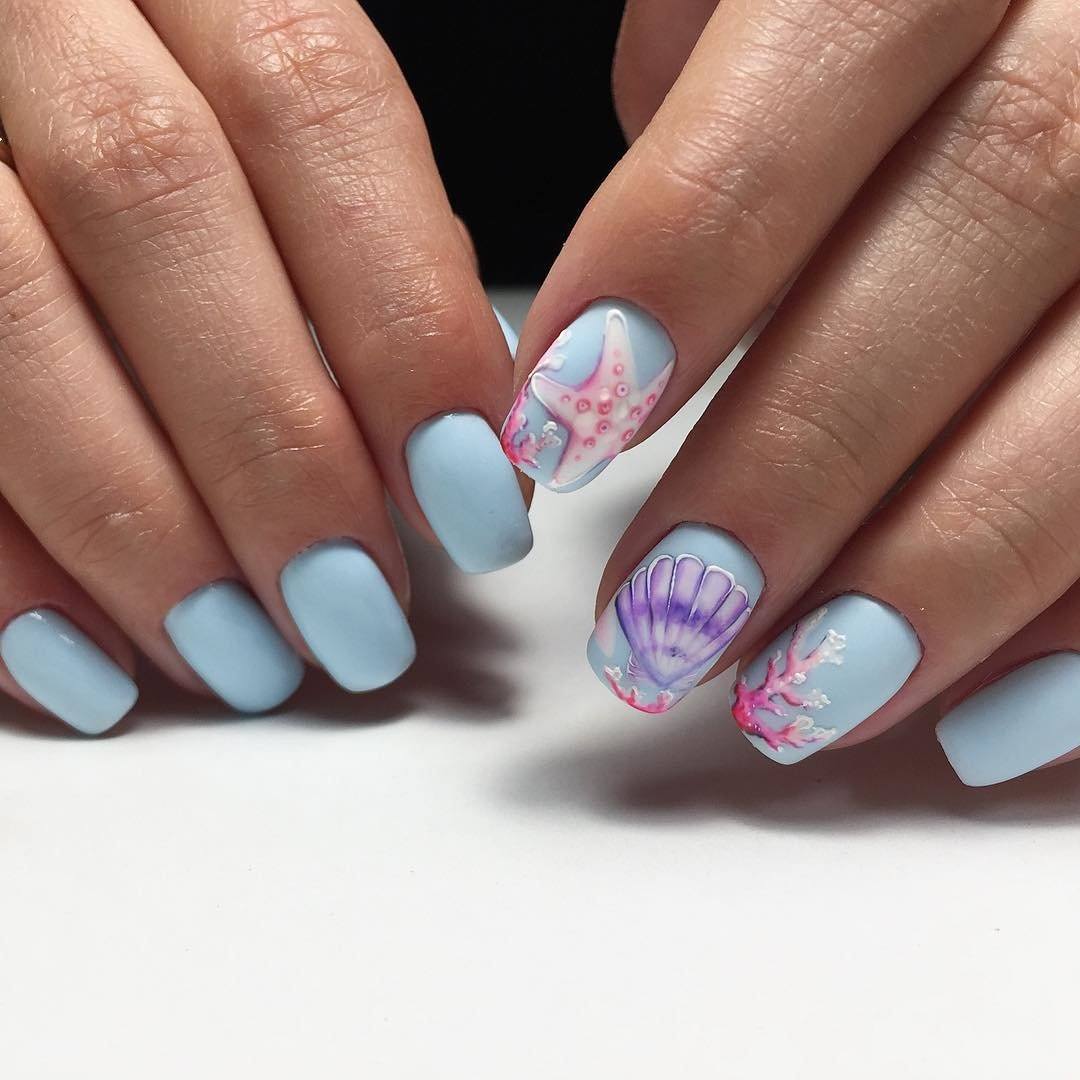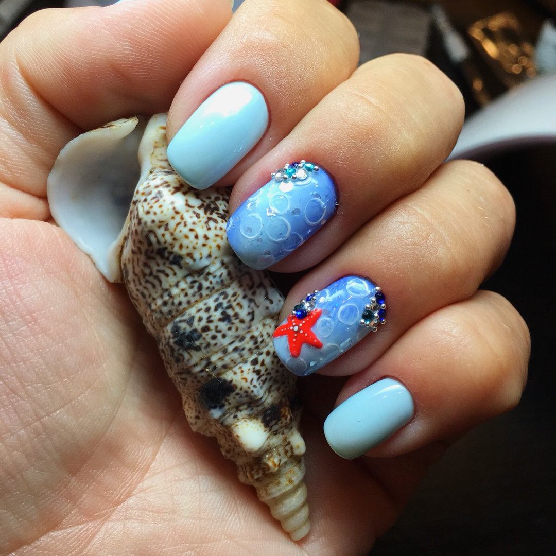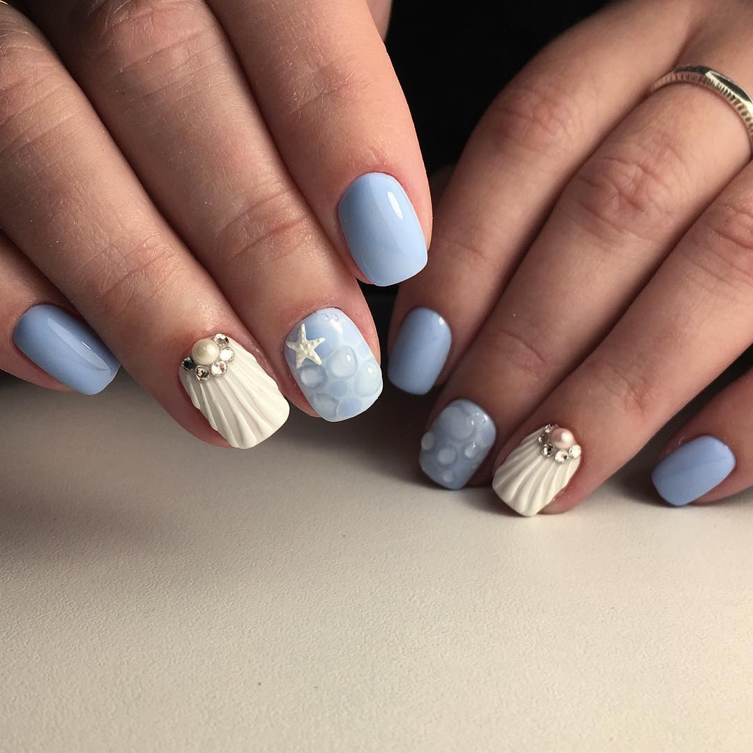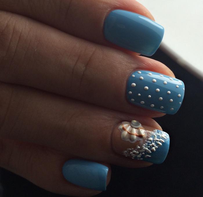 En vacances, presque tout type de décor conviendra. Mais il est très important qu'il soit dans son ensemble harmonieux. Les coquillages décoratifs, les étoiles de mer et les perles sont les options les plus populaires. Après tout, ce sont eux qui soutiennent le thème marin, de sorte que la manucure sera bien combinée avec n'importe quel moyen.