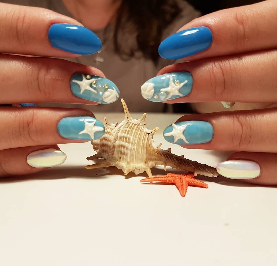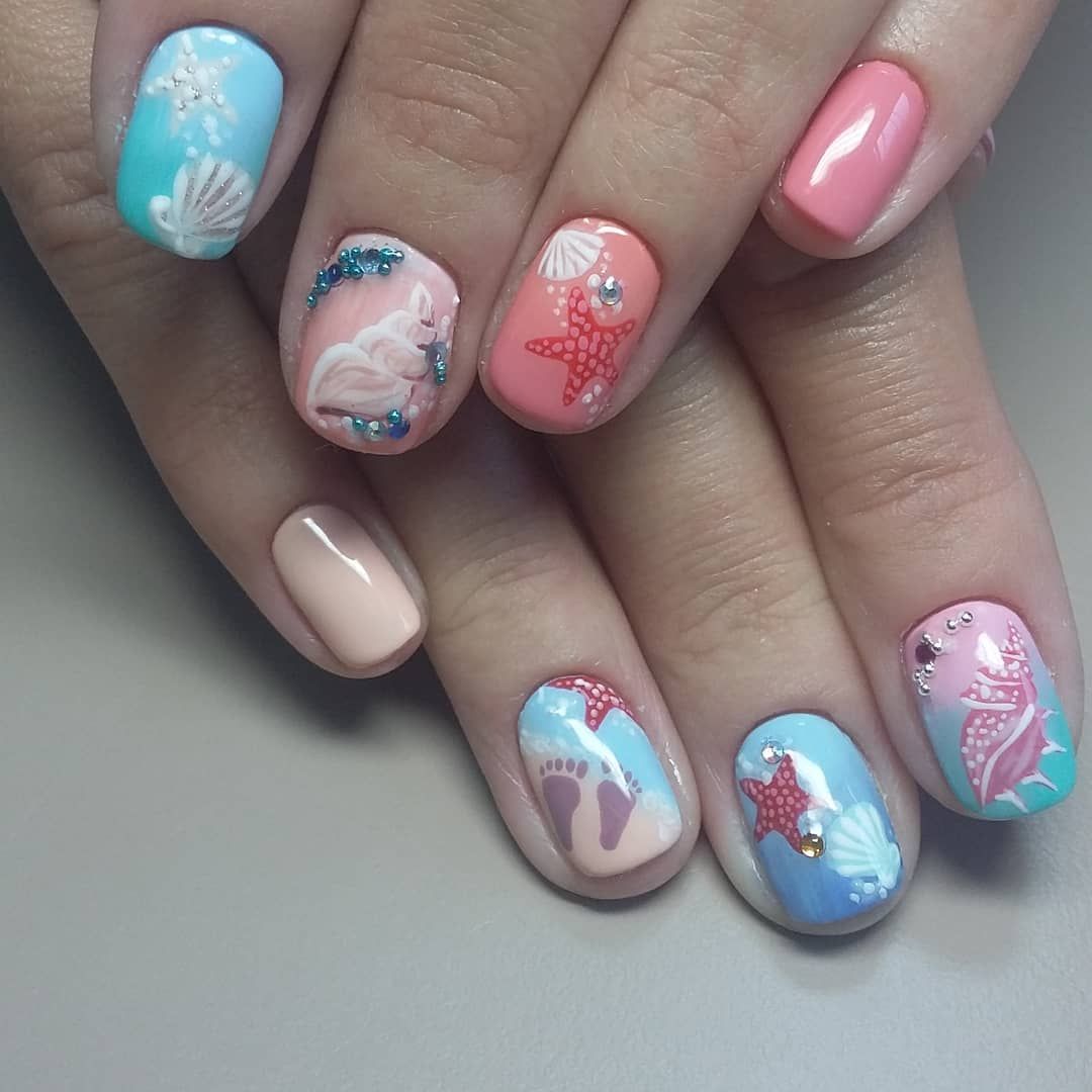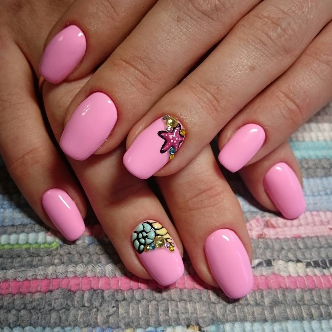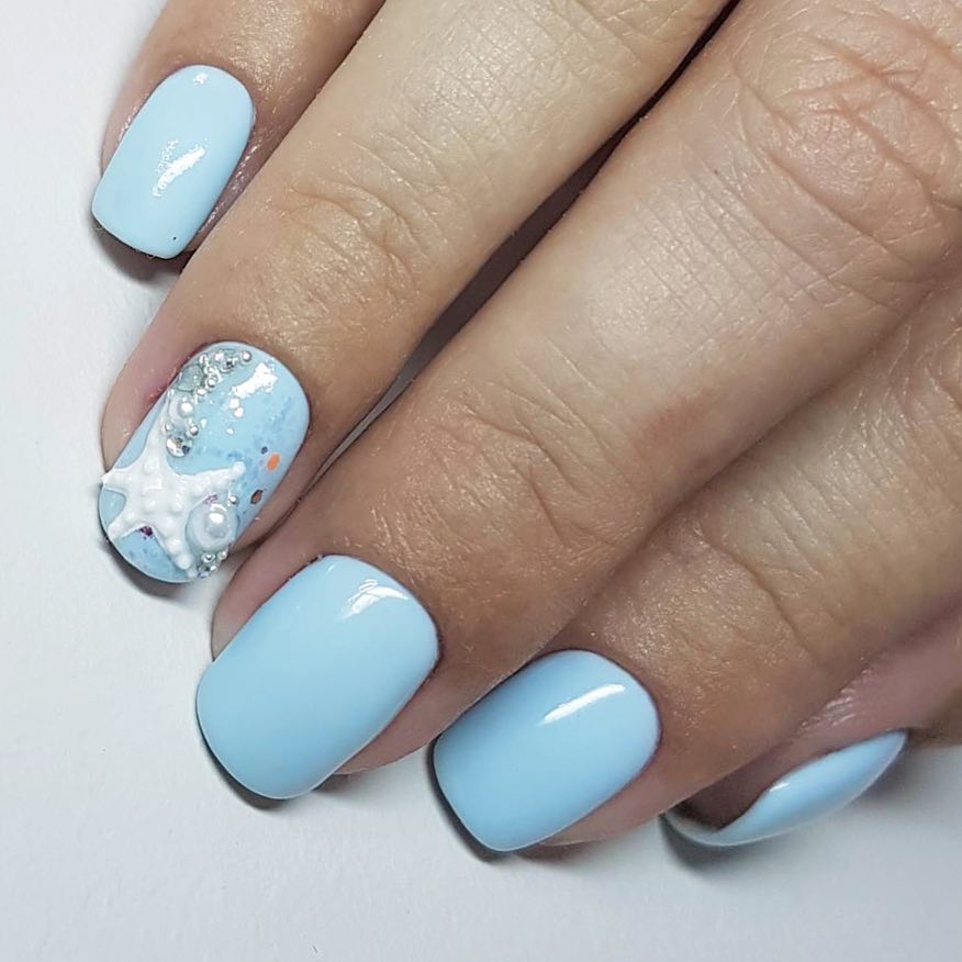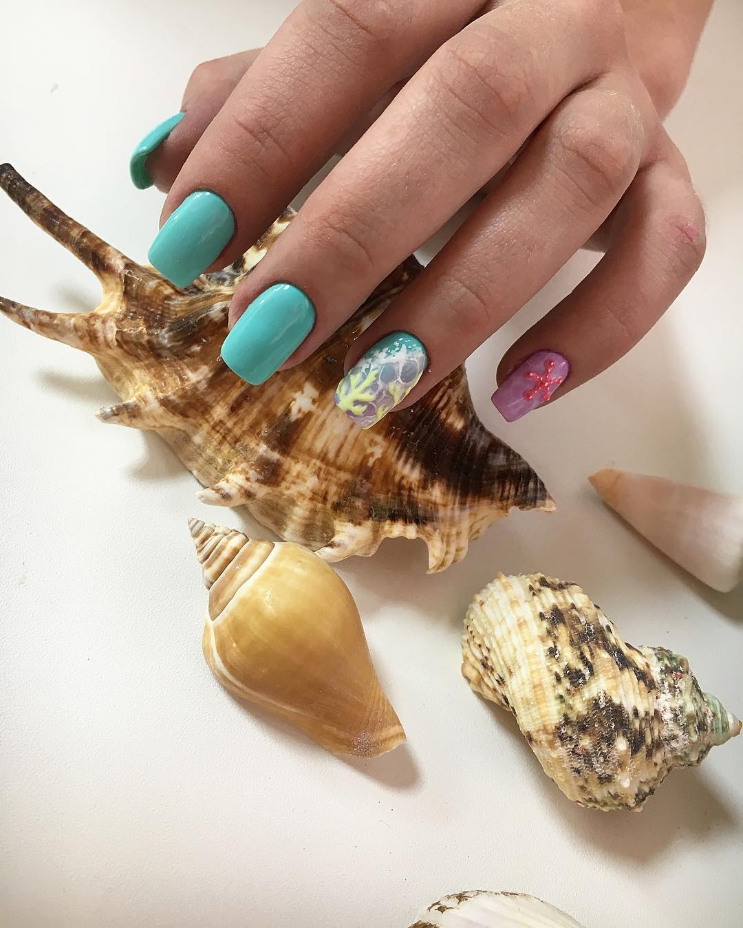 En vacances, presque tout type de décor conviendra. Mais il est très important qu'il soit dans son ensemble harmonieux. Les coquillages décoratifs, les étoiles de mer et les perles sont les options les plus populaires. Après tout, ce sont eux qui soutiennent le thème marin, de sorte que la manucure sera bien combinée avec n'importe quel moyen.