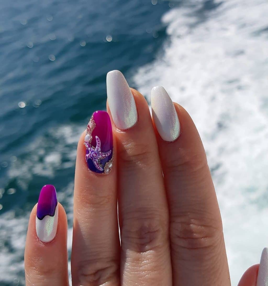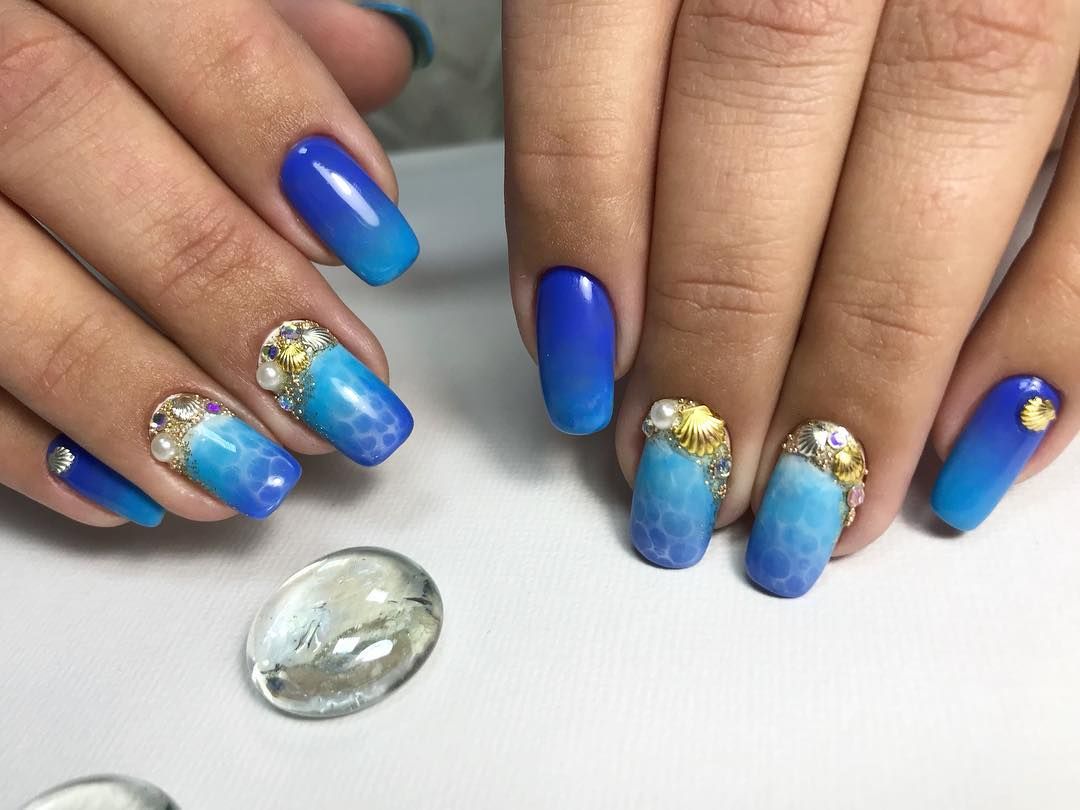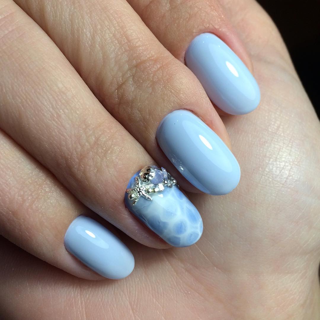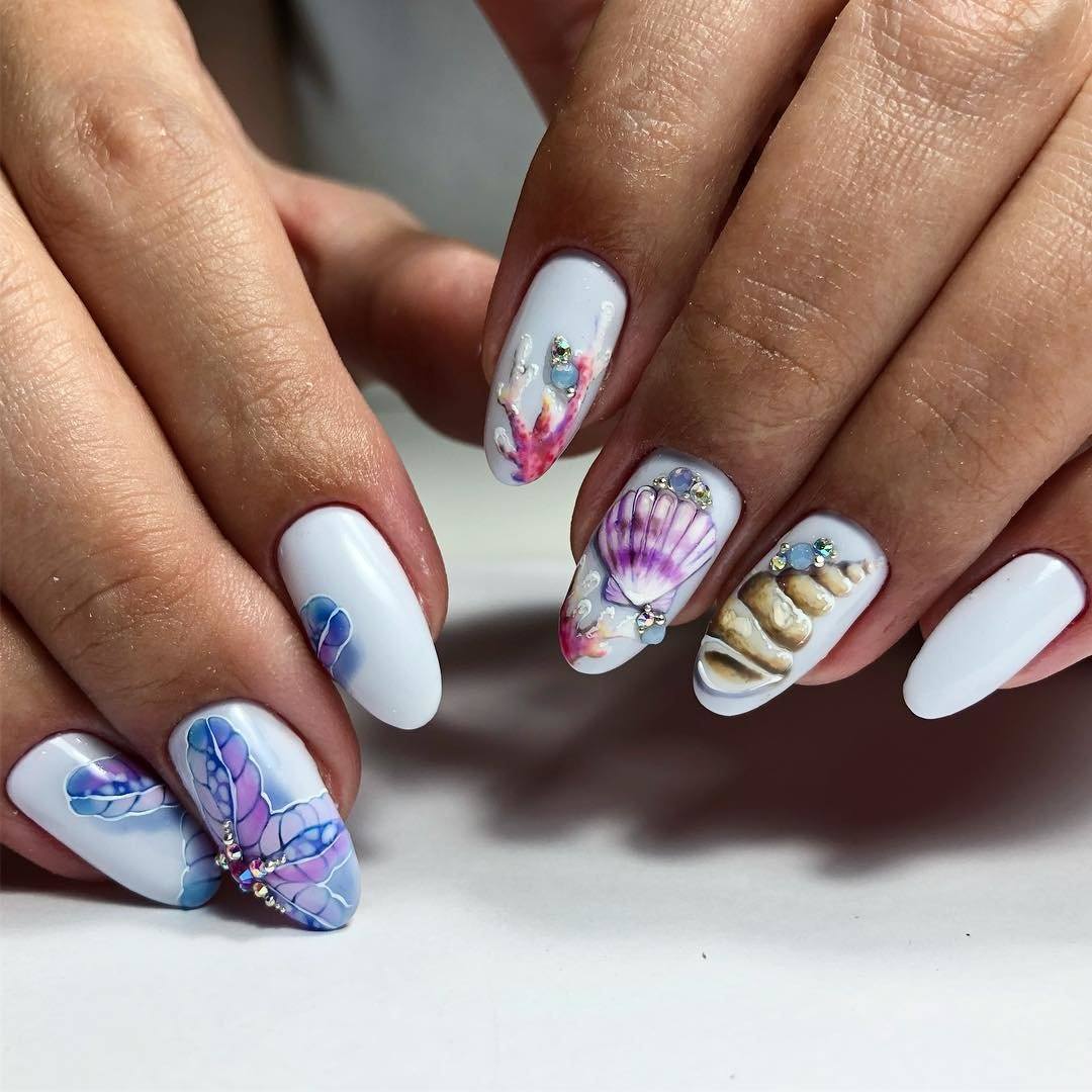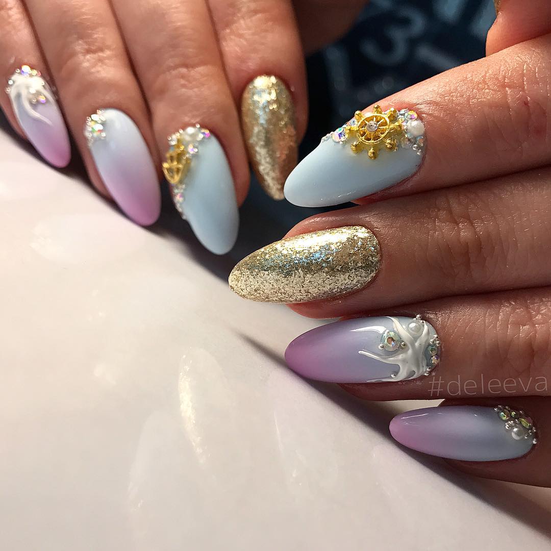 En vacances, presque tout type de décor conviendra. Mais il est très important qu'il soit dans son ensemble harmonieux. Les coquillages décoratifs, les étoiles de mer et les perles sont les options les plus populaires. Après tout, ce sont eux qui soutiennent le thème marin, de sorte que la manucure sera bien combinée avec n'importe quel moyen.