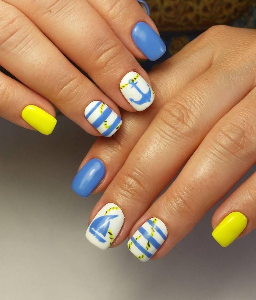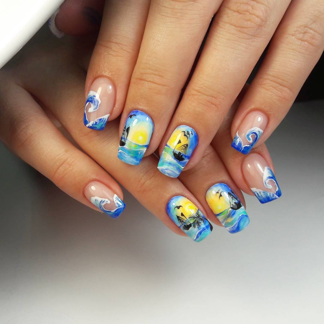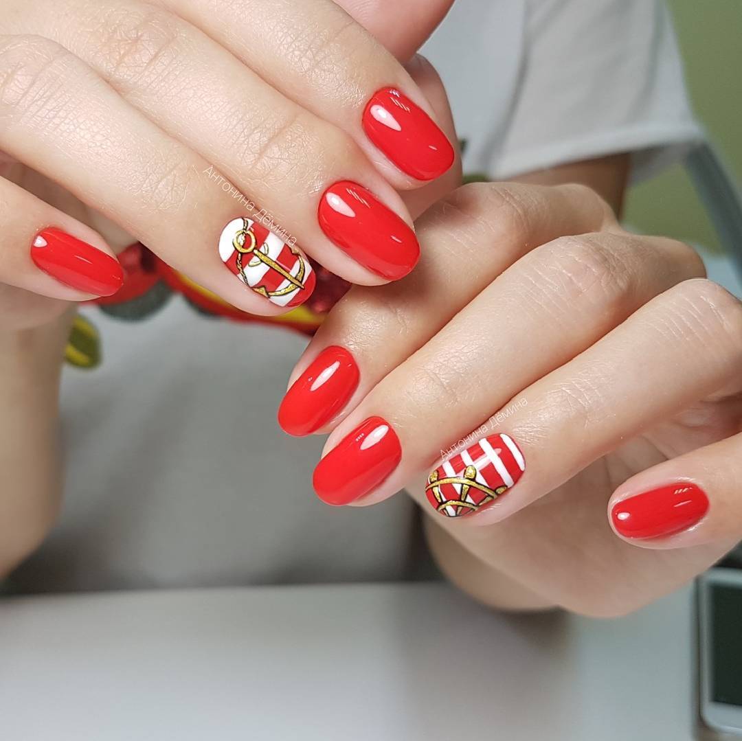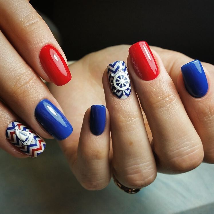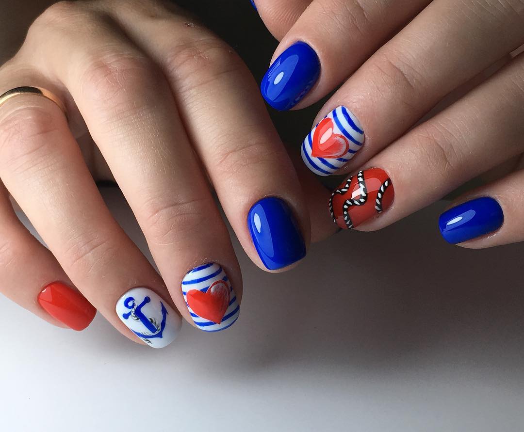 Au vu des tendances actuelles en 2026, il convient de noter des dessins à thème pour des vacances. Parmi eux se trouvent les paysages marins habituels, ainsi que des attributs sous forme de barre et d'ancre. De tels dessins peuvent sembler banals. Pour les diversifier un peu, nous vous recommandons d’utiliser des éléments décoratifs. Par exemple, accentuez les rayons du soleil avec des inserts provenant du frottement et disposez le sable avec une poudre de velours spéciale.