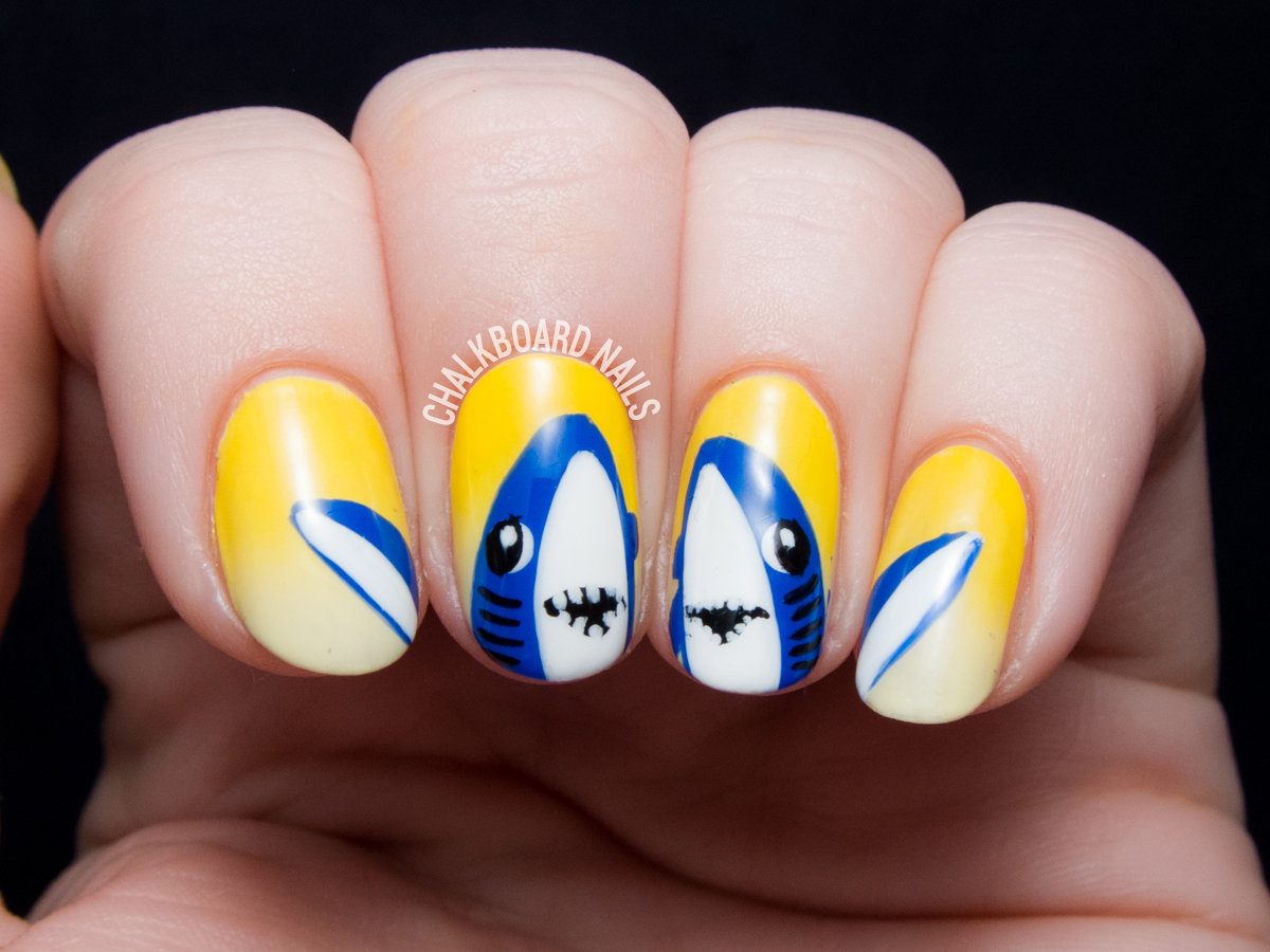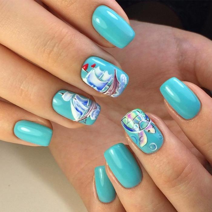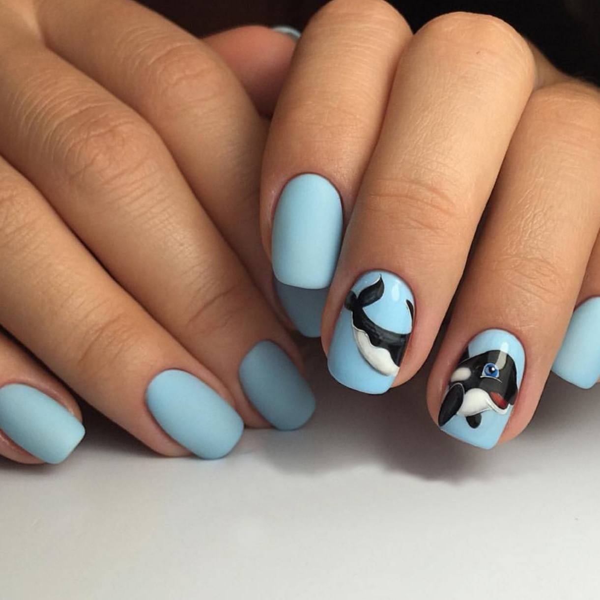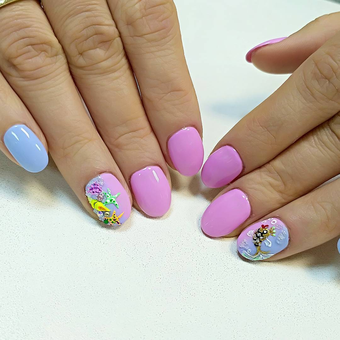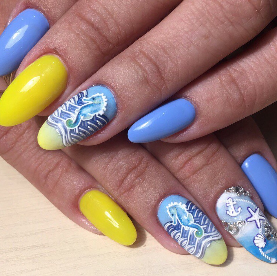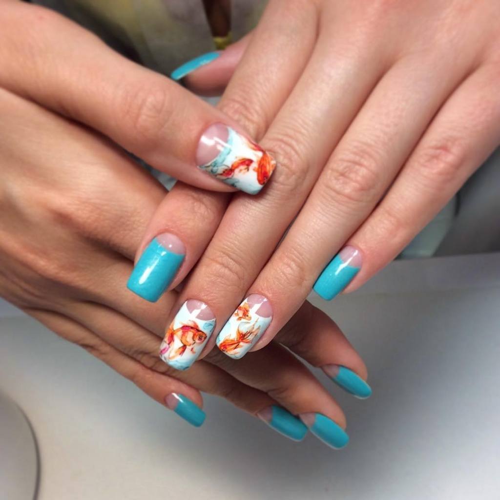 Excellente idée pour la conception des ongles - poisson ou hippocampe. Vous pouvez dessiner une telle image dans une variété de styles. En outre, beaucoup dépend du schéma de couleurs choisi. En passant, ces dessins ont fière allure sur des ongles courts. Mais le décor supplémentaire est préférable de ne pas utiliser.