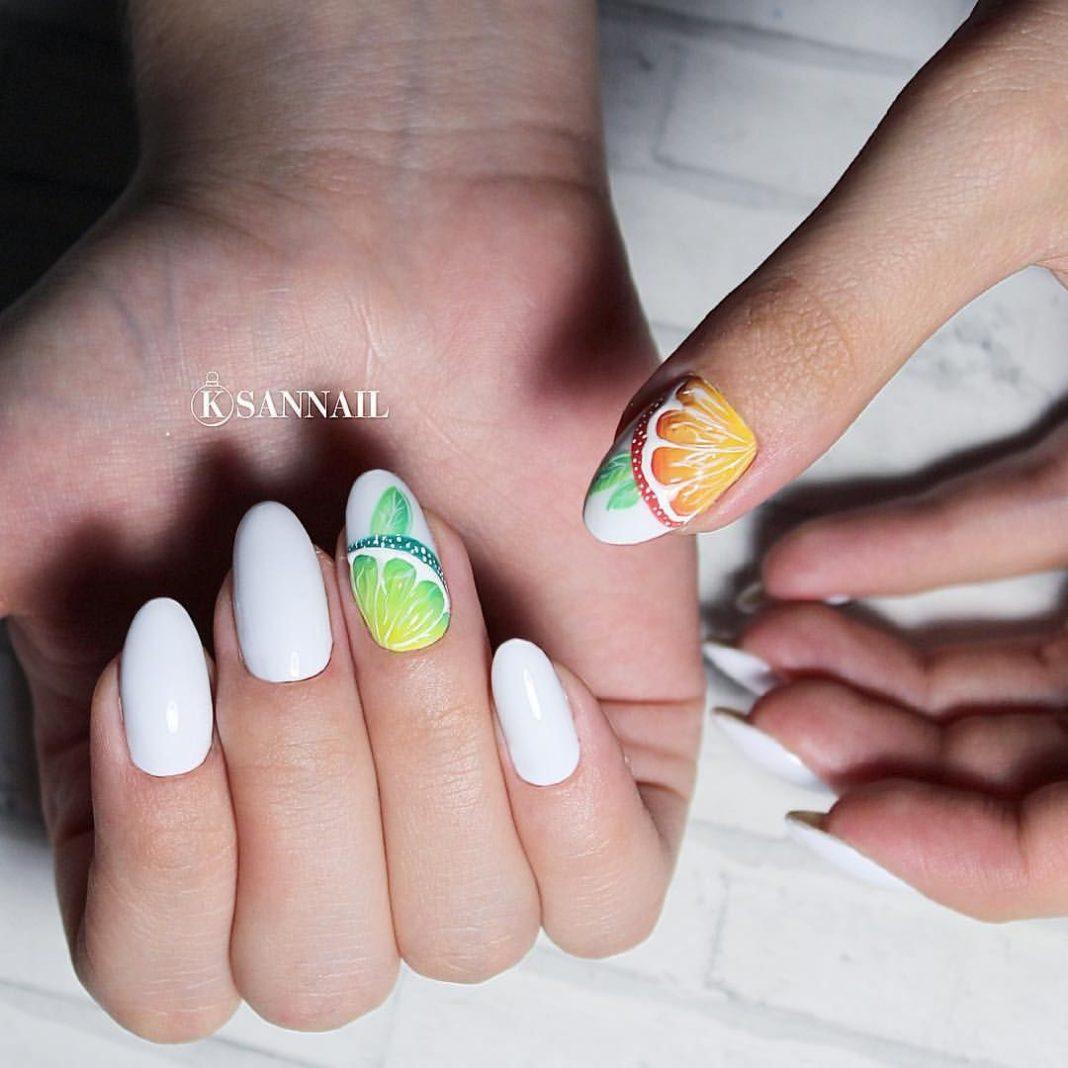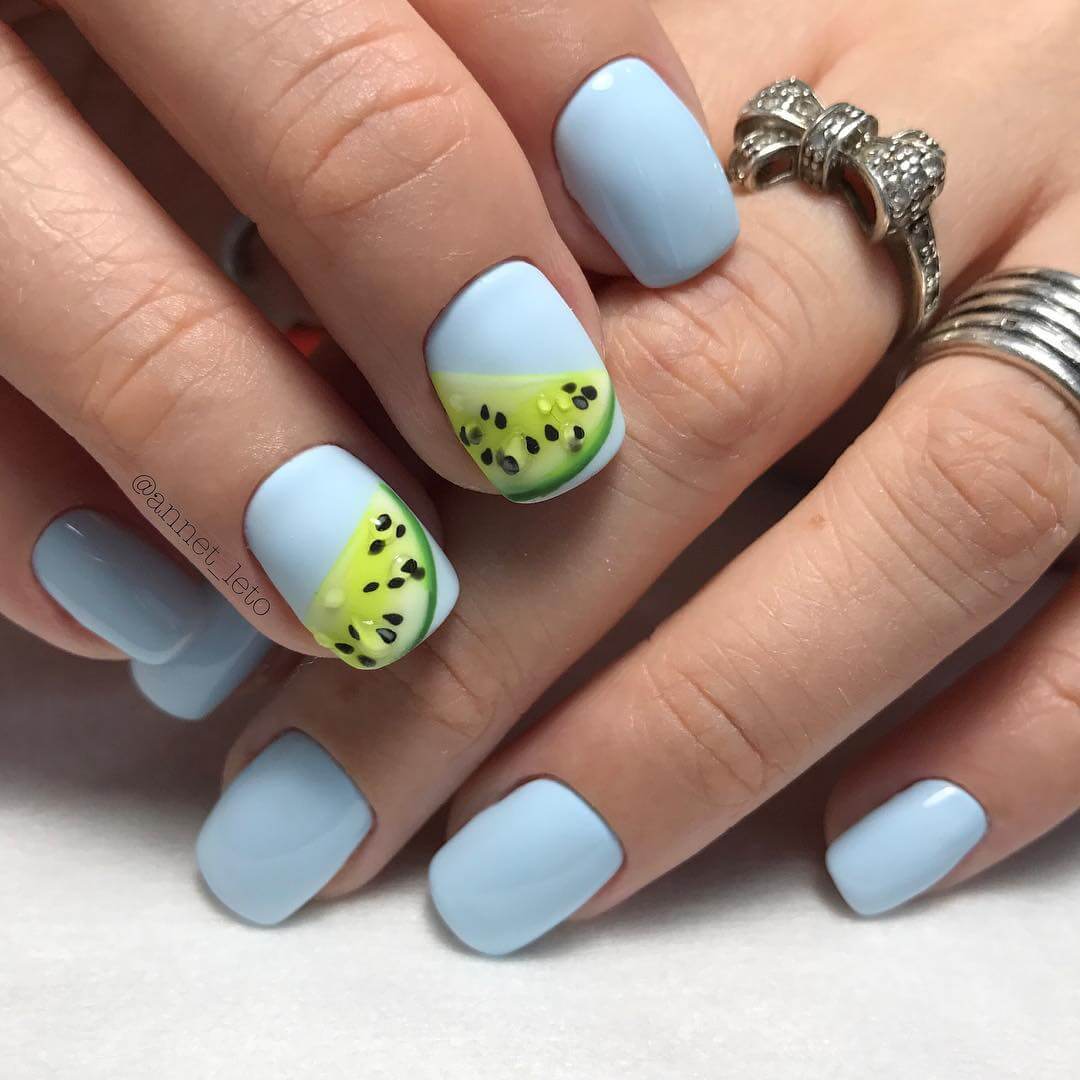 En été, je veux expérimenter plus que jamais, en ajoutant des détails clairs, du moins dans la conception des ongles. Cette année, nous vous suggérons de rappeler la photo sous la forme de vos fruits et baies préférés. Imaginez, les fraises, les framboises, les bananes, la pastèque ou le kiwi peuvent devenir un ornement de vos ongles. Une telle manucure a toujours l’air juteuse et fraîche.