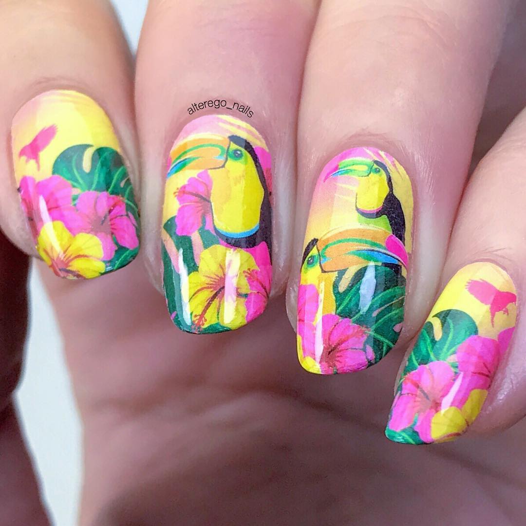 En combinaison avec un imprimé tropical, presque n'importe quel décor a fière allure. Cependant, les plus populaires étaient les strass, les étincelles et les frottements. Tout cela donne à la manucure une luminosité spéciale en été.