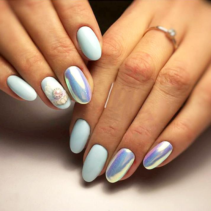 Manucure avec un design de coquille a l'air vraiment élégant et doux. Un maître des ongles expérimenté pourra concrétiser une telle idée en quelques minutes.Par ailleurs, le frottement des perles est souvent utilisé dans ce cas. Sa brillance est douce et à peine perceptible, ce qui n’est perceptible qu’au soleil.