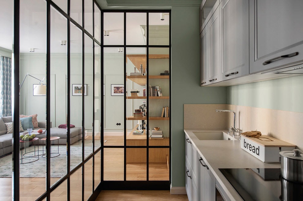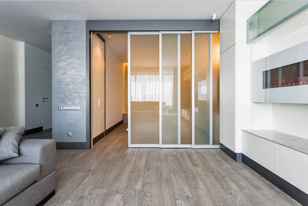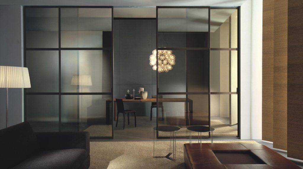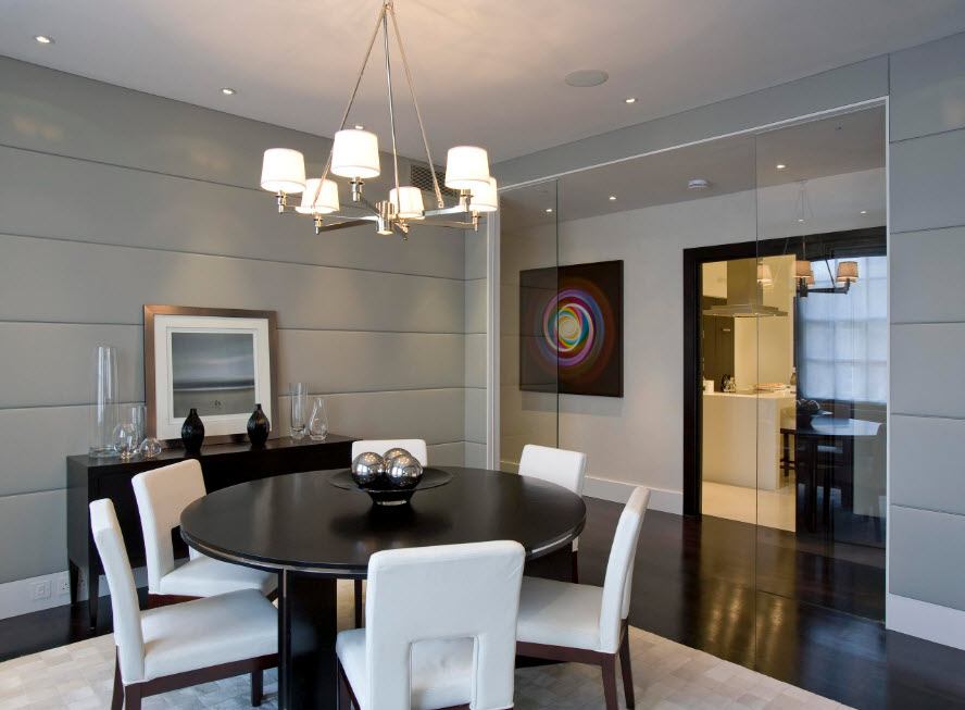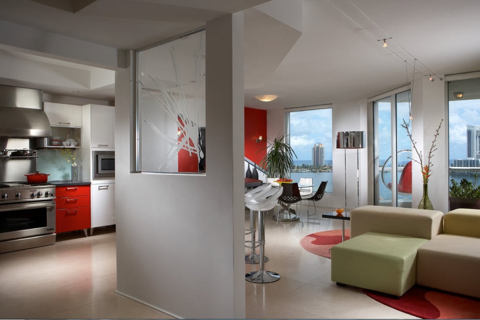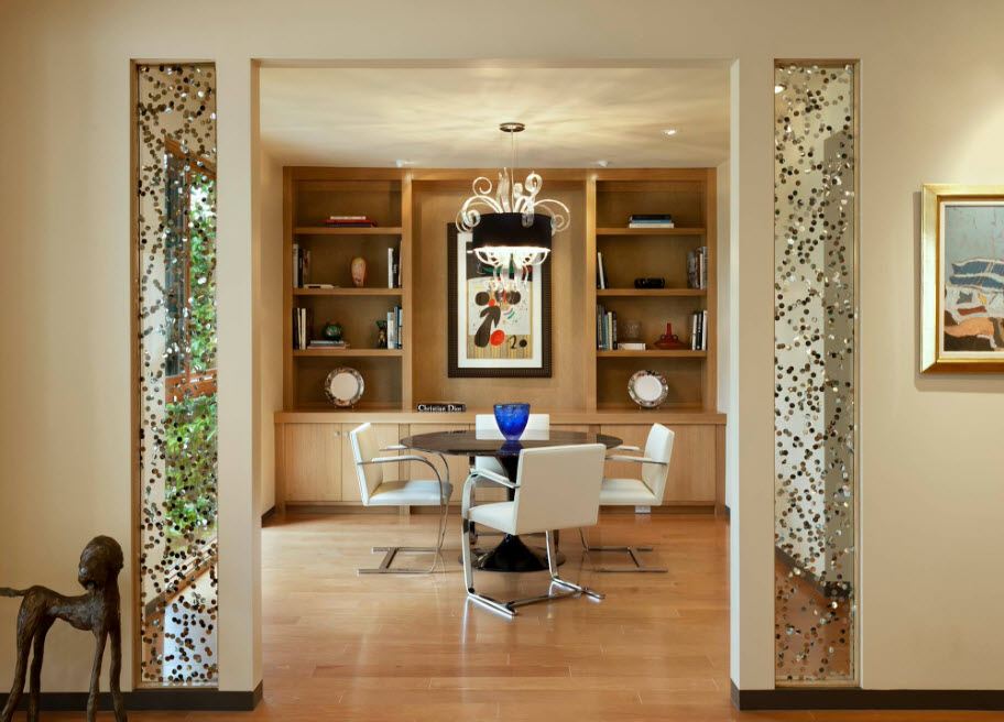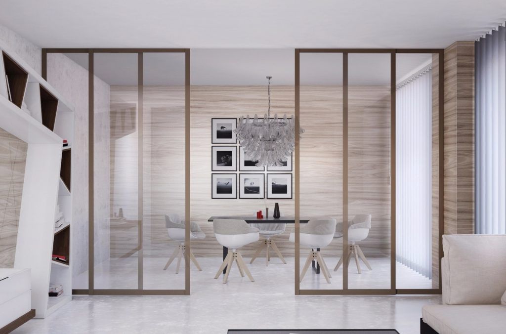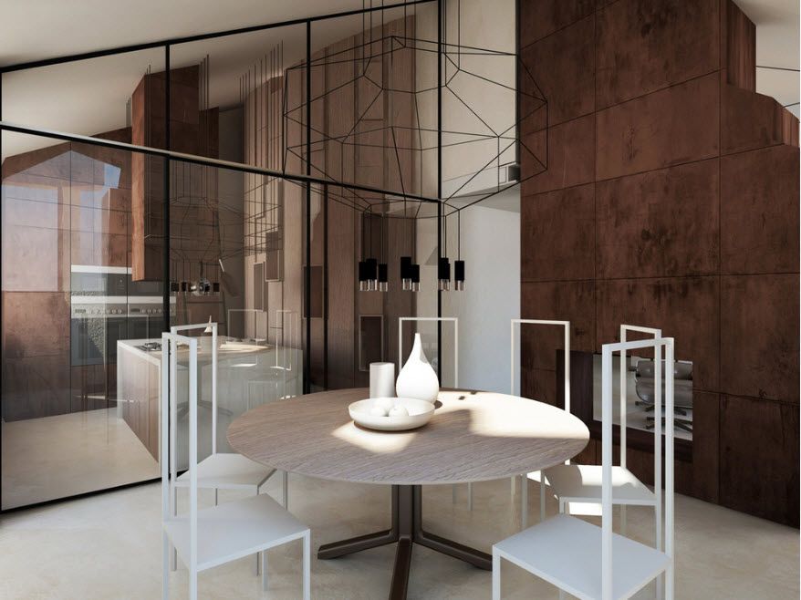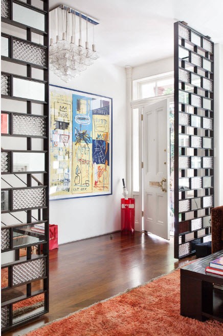 Pour créer un zonage clair et préserver la diffusion de la lumière aux quatre coins de la pièce, des cloisons intérieures en verre sont utilisées. Le verre est utilisé durable - rouge vif. Il peut être transparent ou mat. Les cloisons en verre réalisées selon la technique du vitrail, avec impression de photos, gravure au laser, avec un motif peuvent devenir un véritable point fort de l'intérieur.