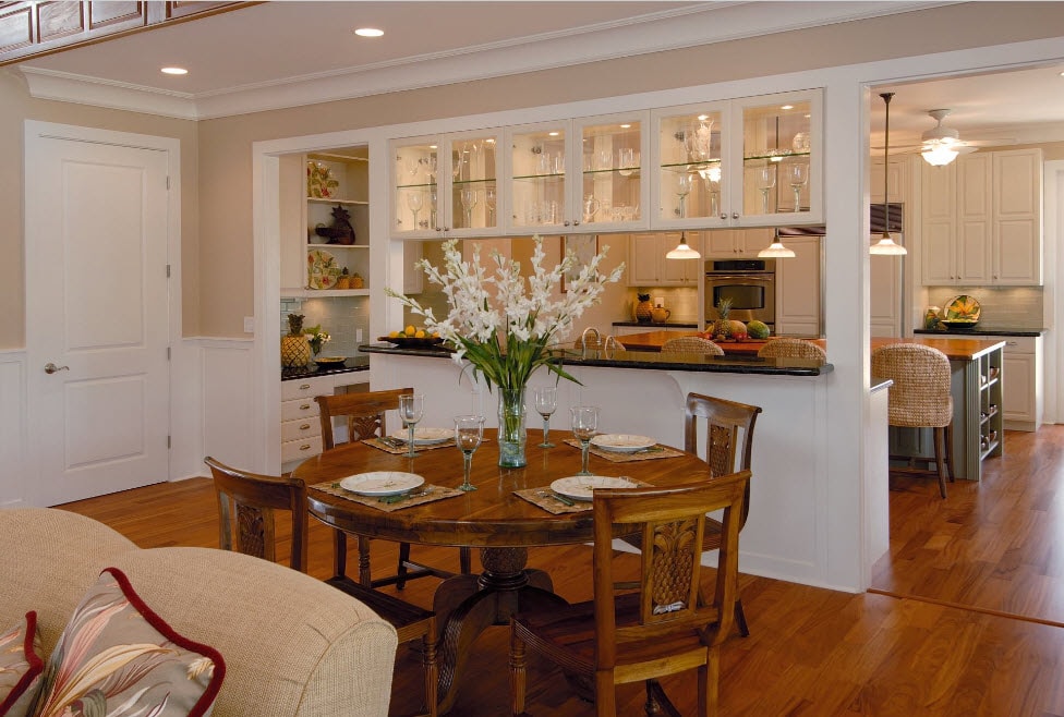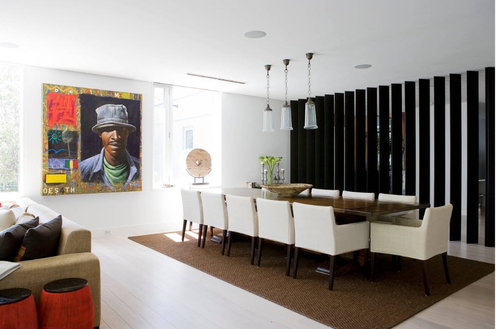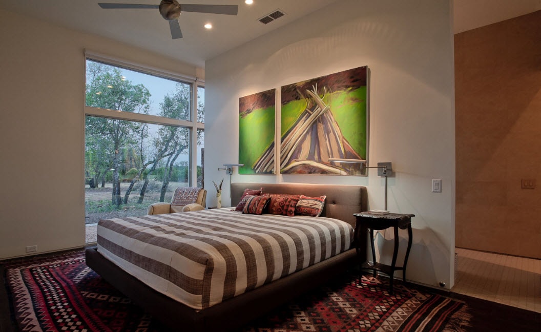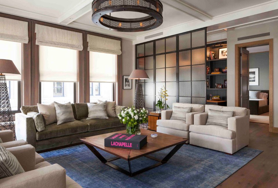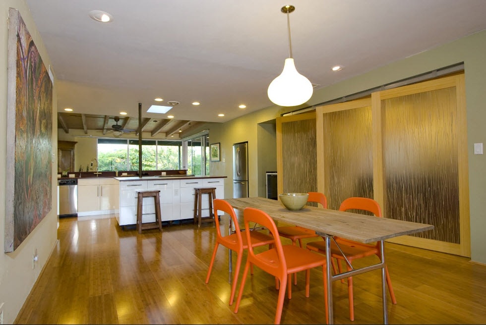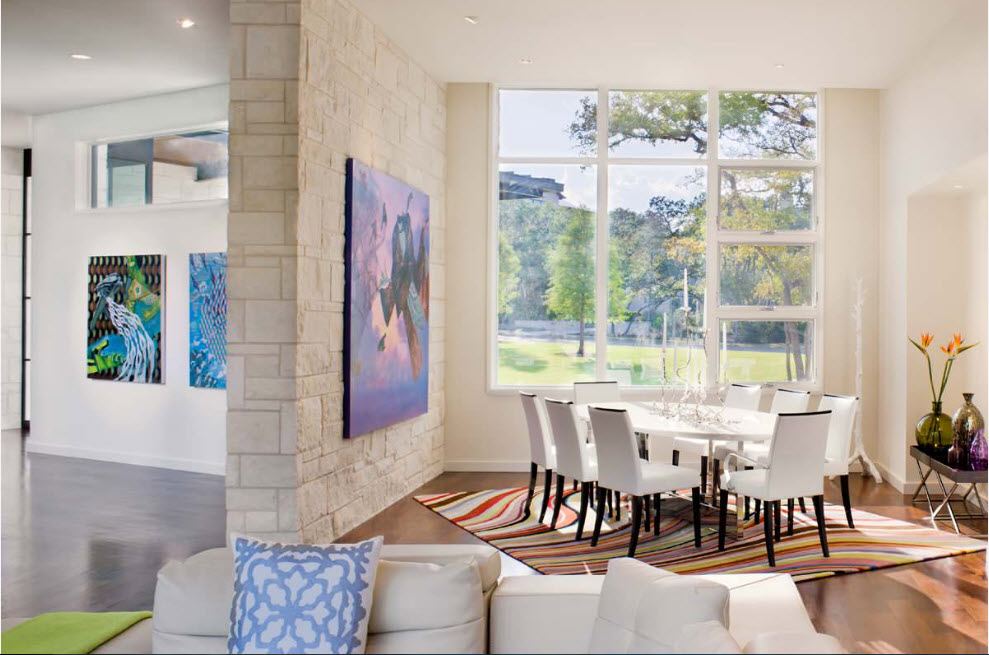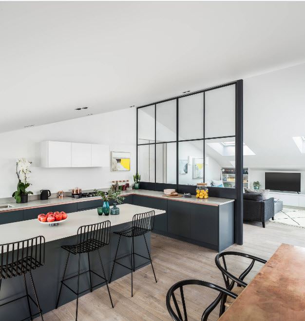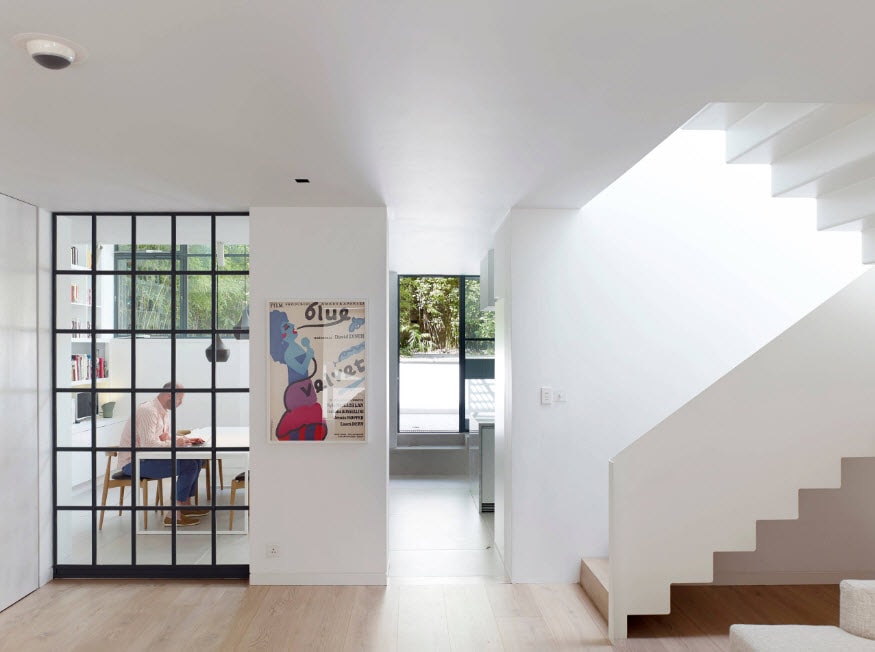 Pour créer un zonage clair et préserver la diffusion de la lumière aux quatre coins de la pièce, des cloisons intérieures en verre sont utilisées. Le verre est utilisé durable - rouge vif. Il peut être transparent ou mat. Les cloisons en verre réalisées selon la technique du vitrail, avec impression de photos, gravure au laser, avec un motif peuvent devenir un véritable point fort de l'intérieur.