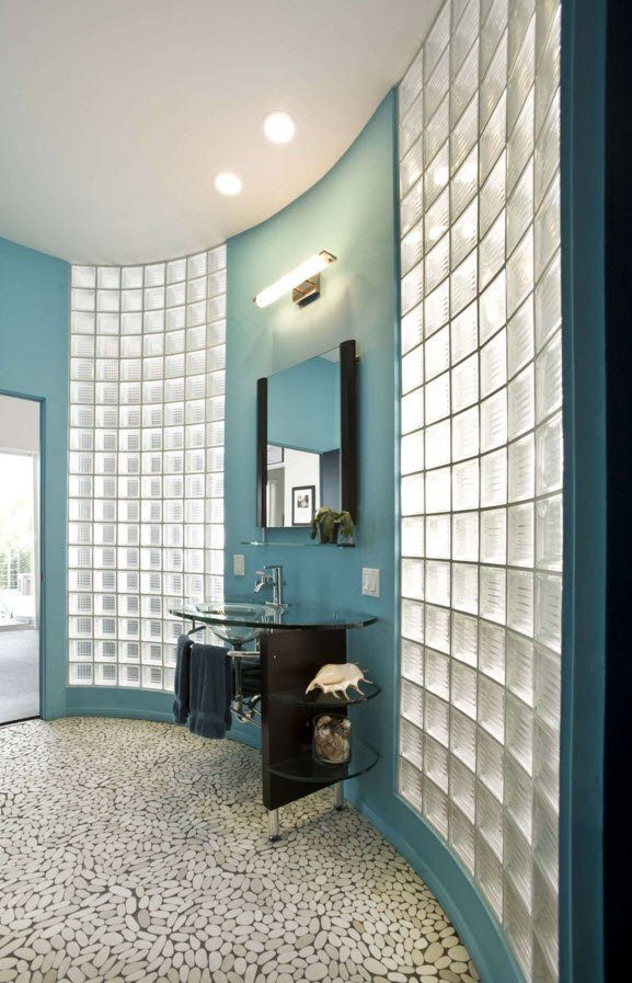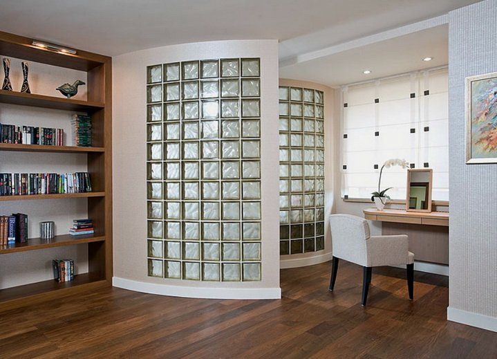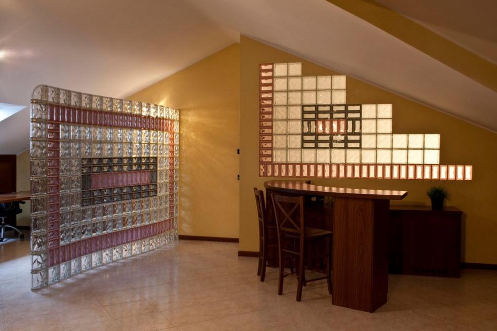 S'il est nécessaire de préserver la pénétration de la lumière dans différents coins de l'espace de la pièce, les cloisons sont constituées de blocs de verre. Il s'avère être un mur durable, résistant à l'usure et durable.