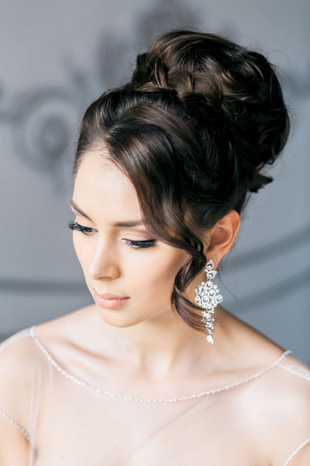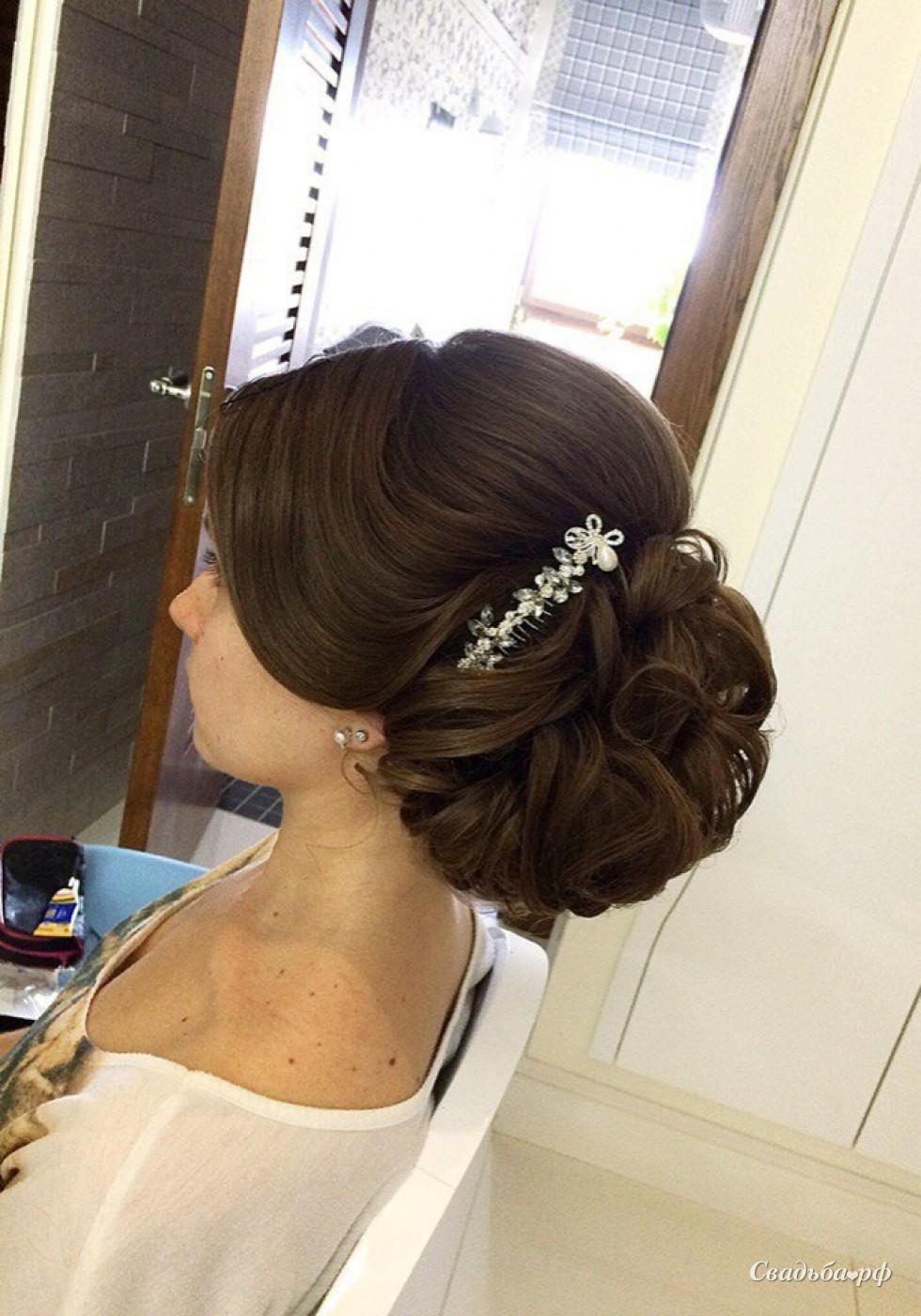 Un volumineux paquet de boucles recueillies à l'arrière de la tête est populaire parmi les mariées depuis plus d'un an. L'avantage de cette coiffure est de donner l'image de la romance et la capacité de montrer la grâce du cou et des épaules. Vous pouvez ajouter des boucles avec des accessoires en plumes, des fleurs délicates ou des bijoux.