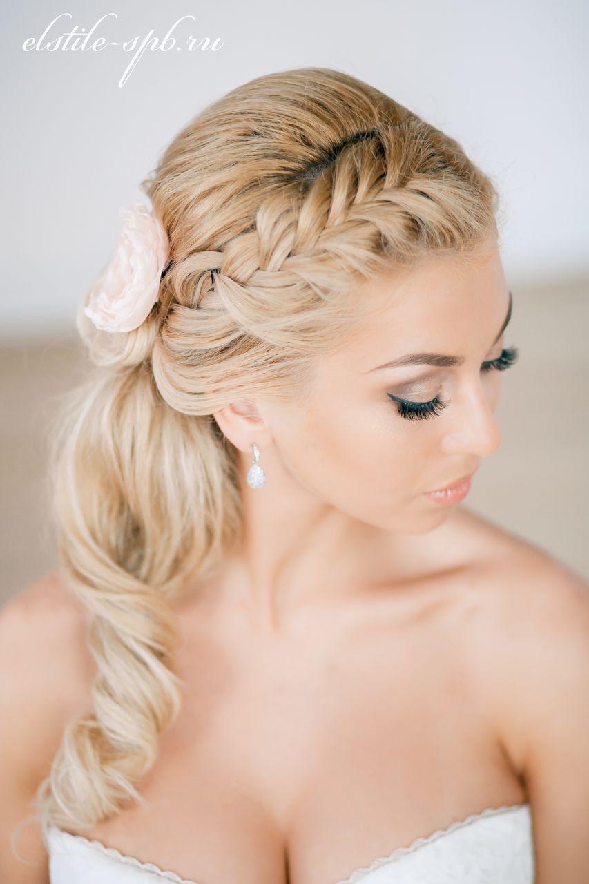 Aujourd'hui, la tendance est un petit épillet modifié et une tresse française inversée. Vous pouvez les décorer avec du fil de perles ou des fleurs fraîches. Les cheveux négligemment entrelacés aident à créer une image sensuelle et séduisante, mettant en valeur la beauté naturelle de la mariée.
