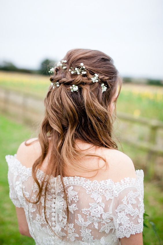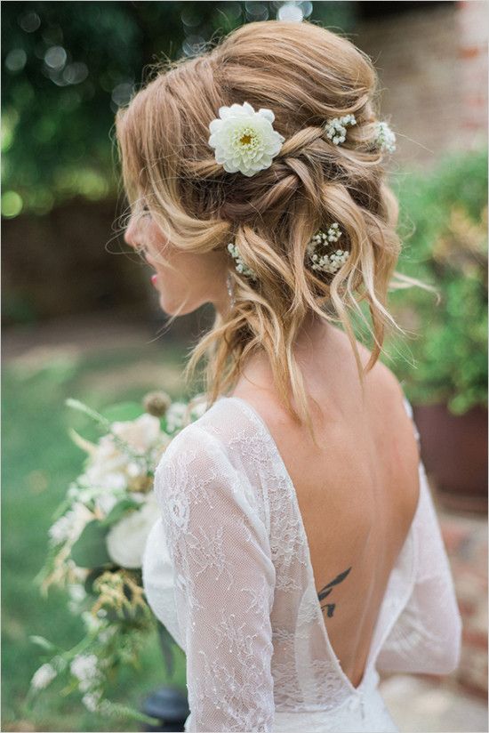 Il convient de noter que ces coiffures sont un excellent ajout à des robes concises dans le style de boho. Il peut aussi s'agir de tissus translucides avec de la dentelle. En tout cas, la mariée dans cette image est l'incarnation du charme et de la vraie féminité. Par conséquent, assurez-vous que les photos sont incroyables.