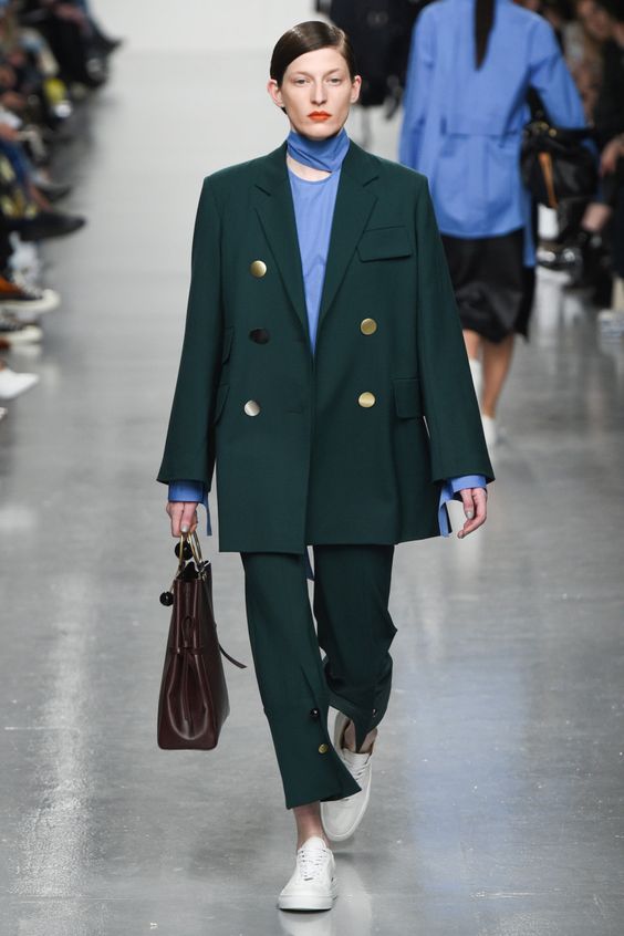Les costumes surdimensionnés seront tout aussi populaires. Ils ont l'air très intéressant, un peu lâche et détendu. En ce qui concerne le tissu, on peut utiliser non seulement le tissu de costume habituel pour la couture, mais aussi le tweed ou même la laine. Dans le même temps, vous pouvez les combiner avec des blouses, des t-shirts et même des hauts.