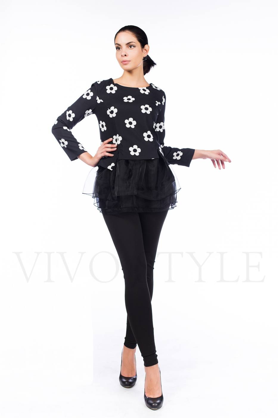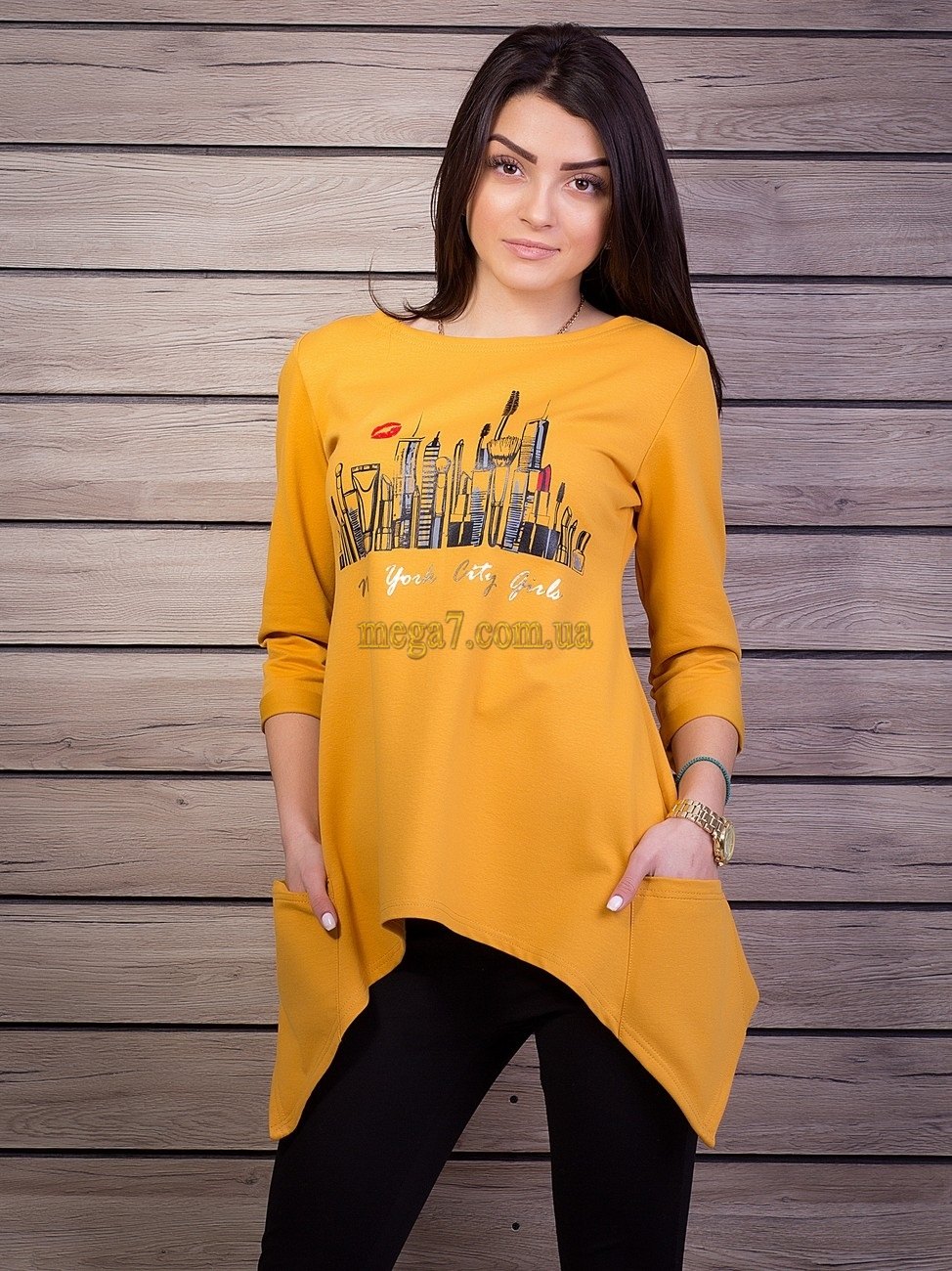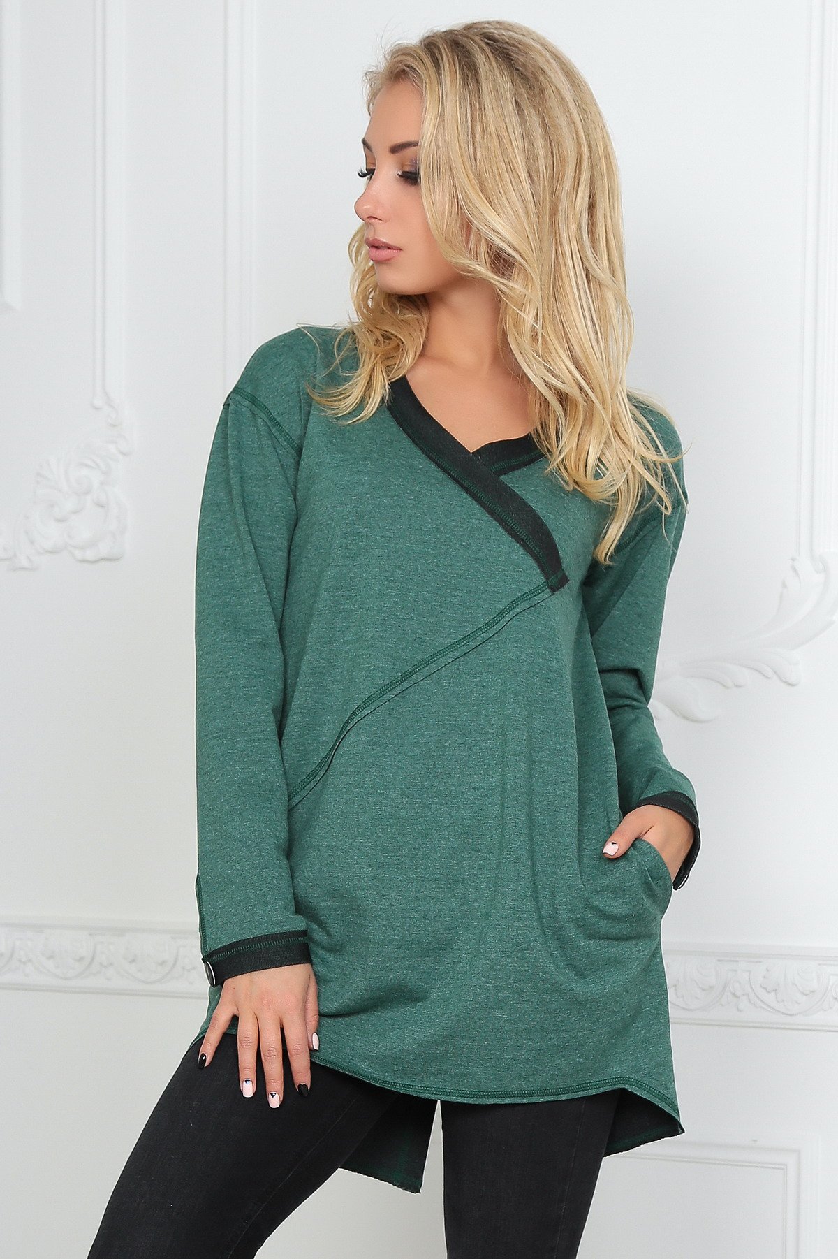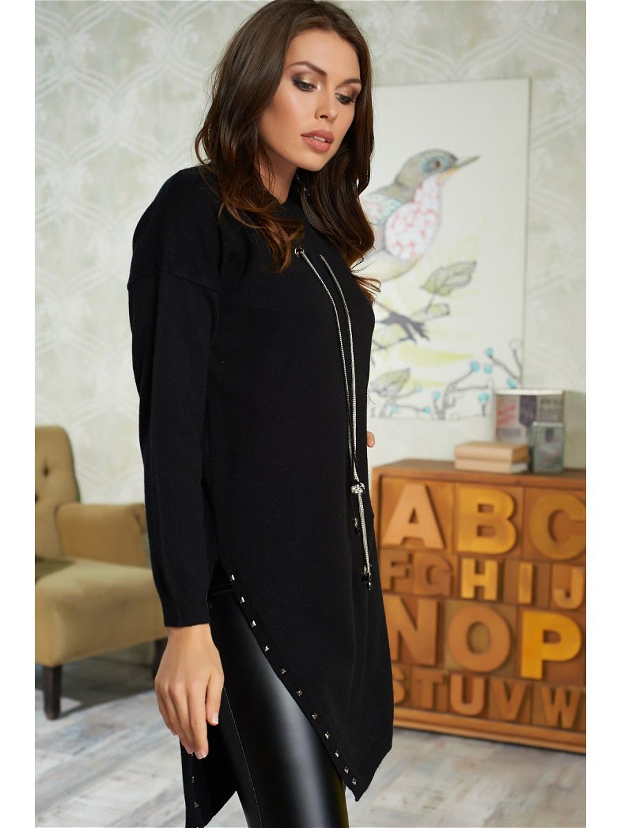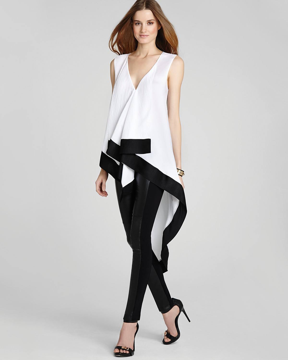 Une combinaison de tissus contrastants (noir avec blanc ou rouge, etc.) a l'air très inhabituelle dans le contexte d'une coupe asymétrique. Portant une telle tunique avec des leggings de couleurs sombres, vous obtiendrez certainement un arc raffiné.