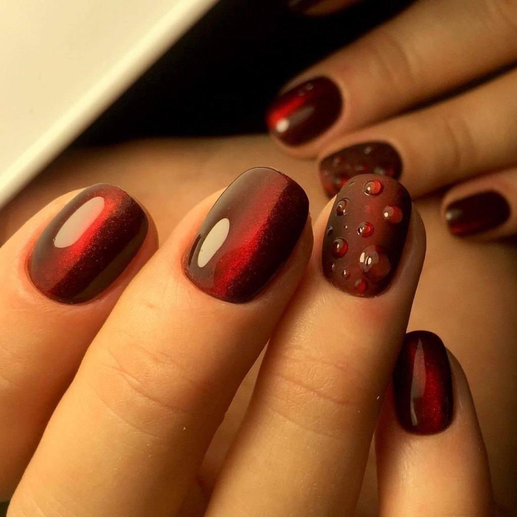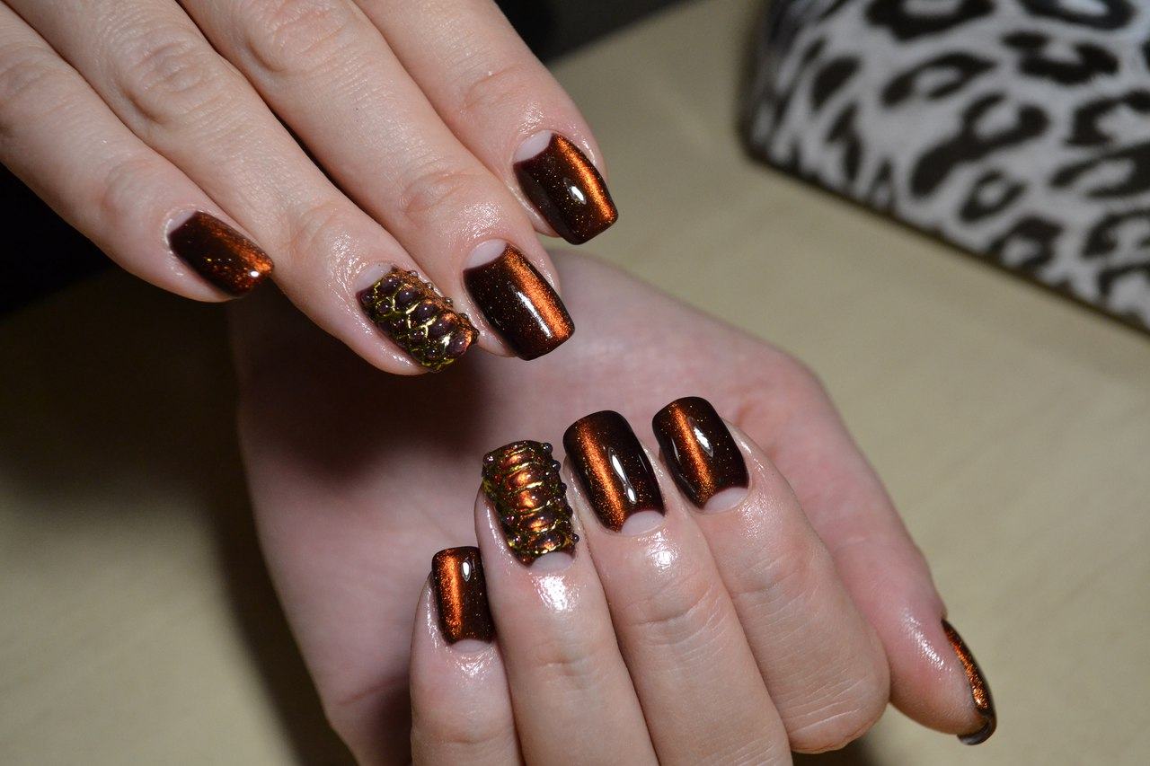 La conception «œil de chat» est accessible non seulement aux propriétaires de longs ongles. En bref, il ne semble pas moins spectaculaire. Pour sa mise en œuvre, un vernis spécial est utilisé, avec une base en métal et des aimants spéciaux, qui créent des motifs spectaculaires sur le revêtement principal, que beaucoup comparent à l'œil du chat.