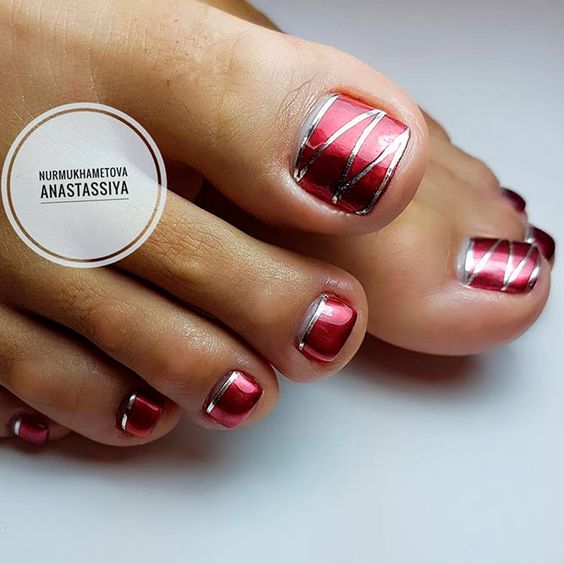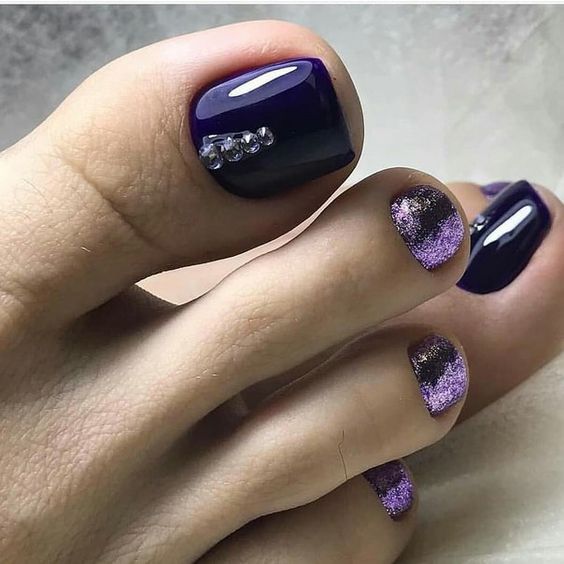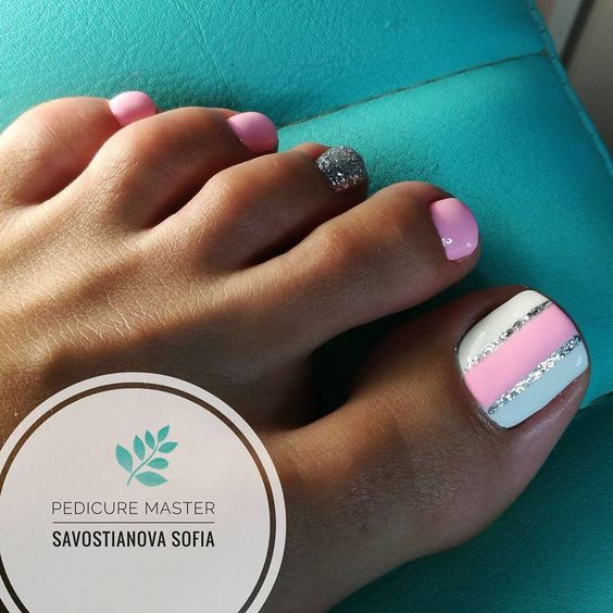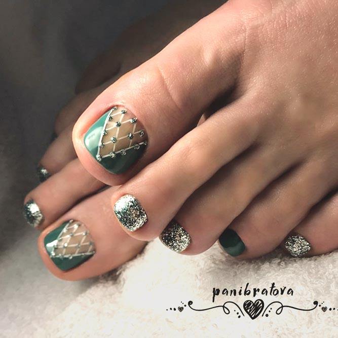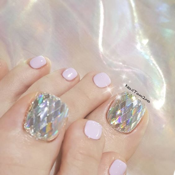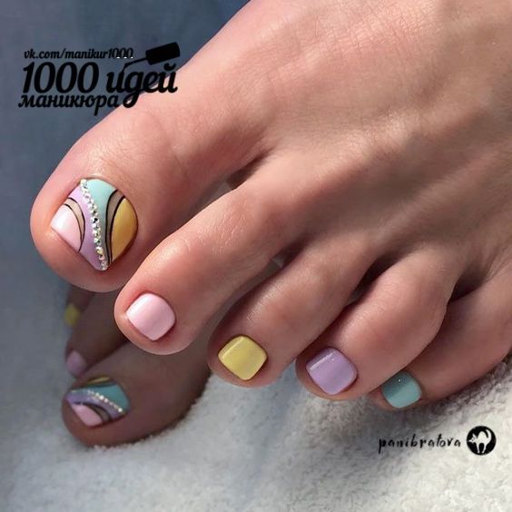 Utilisez un vernis à paillettes pour créer une pédicure à paillettes. Si vos préférences sont plus vastes, utilisez les idées les plus complexes de bijoux dans la pédicure: utilisez kamifubuki, verre brisé, bouillons, technique de frottement. En 2026, artistes et designers raviront les fashionistas avec une variété de styles, d'idées et de combinaisons complexes de techniques différentes avec des strass dans une pédicure. De minces bandes de paillettes ou un mince ruban en 2026 sont de plus en plus utilisés pour décorer une surface unie.