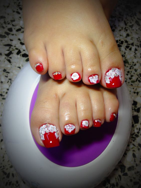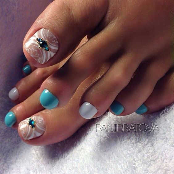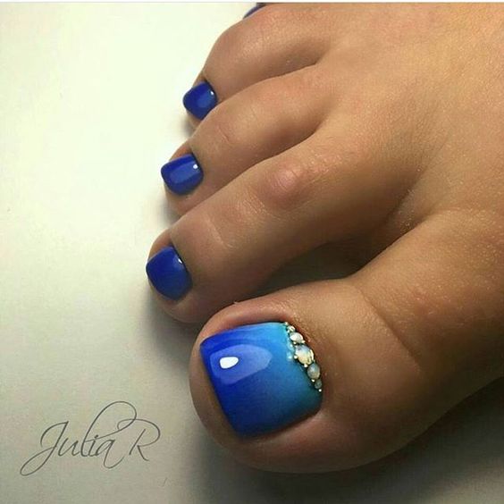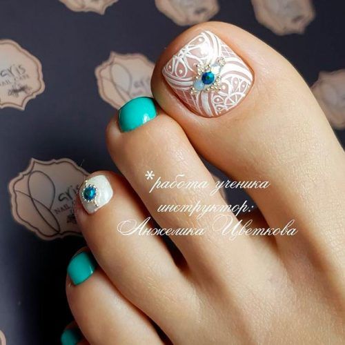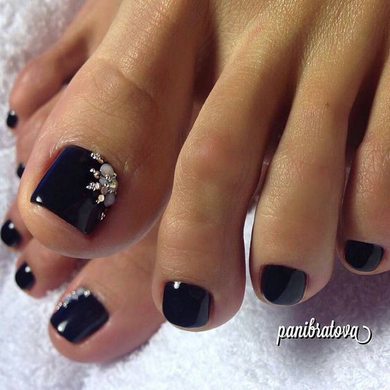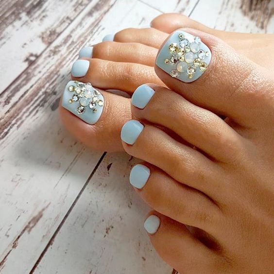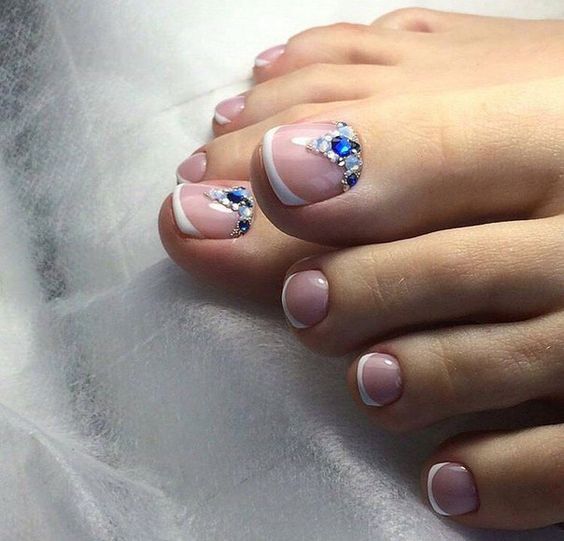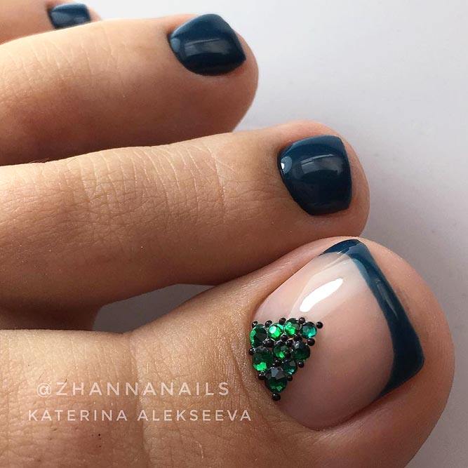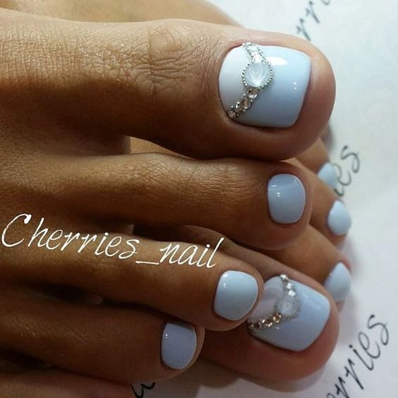 Pédicure enchanteur avec présence de strass n’a pas perdu de sa pertinence. Les rayons du soleil, repoussant le rayonnement des strass, ne laisseront pas passer inaperçu votre élégante pédicure. Il est à noter que des éléments plus volumineux doivent être utilisés dans une seule version, ce qui en fait la partie principale de l'image.