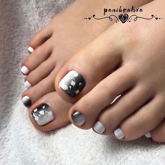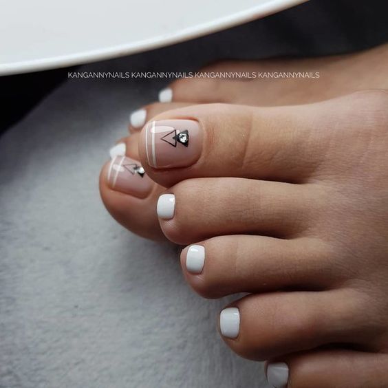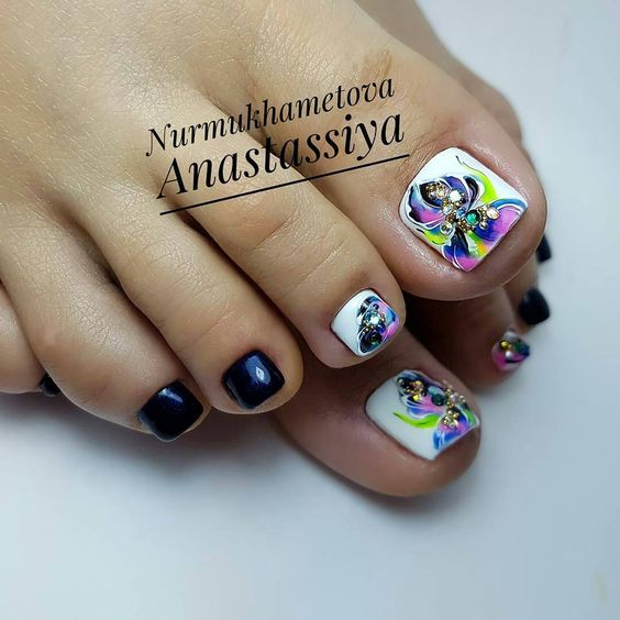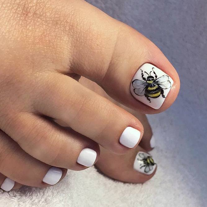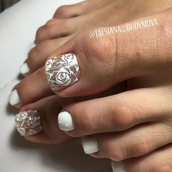 Le revêtement blanc offre une excellente occasion de représenter quoi que ce soit sur les ongles des pieds. Sur un fond blanc, vous pouvez placer des morceaux de verre brisé ou de papier d'aluminium qui scintillent dans différentes nuances et rendent l'image unique et unique. Élégant sont considérés comme des solutions contrastées. Sur la surface blanche de base, les dessins aux couleurs vives sont parfaits. Des dessins variés sur la surface latérale, ainsi que l’image de petits motifs floraux tout autour du souci, sont étonnants. De cette façon, vous pouvez créer un cadre élégant et magnifique.