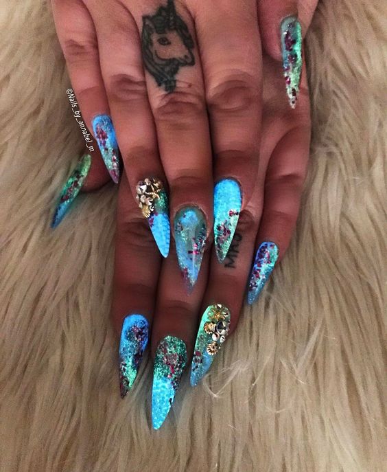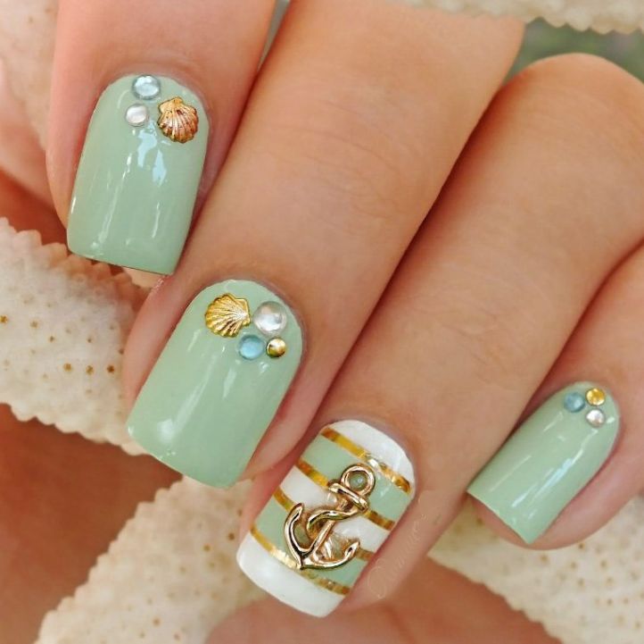 Vous pouvez rendre une manucure marine plus spectaculaire à l'aide d'éléments décoratifs. Les strass soulignent parfaitement la beauté du design choisi pour les ongles d'été. Les paillettes imitent assez bien le sable sur une plage propre sous le drapeau bleu. Le matériau permettant de créer l’effet du verre brisé peut être joué et recréé sur l’ensemble des ongles avec un rivage sableux près de la mer. Toutes les options de manucure marine sont extraordinaires. Le thème de la mer et de la plage de sable est très populaire. C'est pourquoi le rêve des maîtres du nail art est en train de grandir et de se manifester chaque saison de plus en plus.