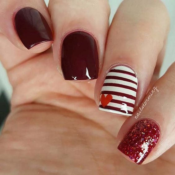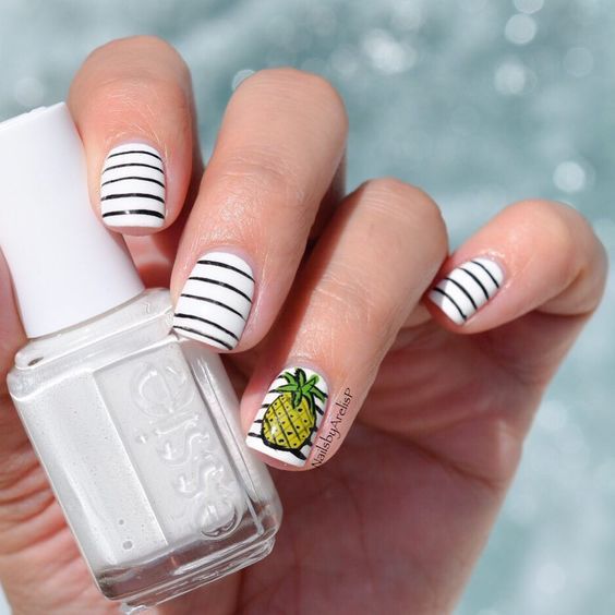 Bande à la mode sur les ongles attire certainement l'attention. La bande convient parfaitement comme image pour une manucure marine. L'été prochain, le dessin des ongles rayés sera à la mode. Le dessin à rayures est très simple à exécuter. Les maîtres ont la main pleine et il ne leur sera donc pas difficile de distinguer un ou deux clous avec un ornement à rayures. Si vous appliquez un motif, par exemple une ancre ou un fruit exotique, sur un enrobage à rayures, vous obtiendrez une manucure marine plus spectaculaire avec une bande. Si vous décidez de fabriquer des bandes vous-même, la précision et la clarté des lignes seront assurées par un ruban adhésif spécial pour manucure ou estampage. Des lignes horizontales ou verticales peuvent remplir toute la plaque à ongles ou seulement une partie de celle-ci. Les rayures multicolores sont inhabituelles et originales. Dans les moteurs de recherche, vous trouverez de nombreuses options pour la manucure en bande marine, mais nous avons simplifié la tâche et proposons les options les plus intéressantes pour la manucure en bande marine sur la photo ci-dessous.