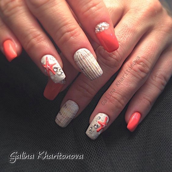 Pas seulement les palmiers, les rayures et les ancres préfèrent les fashionistas lors du choix d’une manucure estivale. Des étoiles de mer, des ananas, des ornements sans prétention, des glaces, des bateaux, des plumes d’un oiseau de feu, des vagues marines, des écailles de poisson et de nombreux autres dessins thématiques liés à la saison estivale s’allaient bien sur des ongles courts et longs. Personne ne vous reprochera de choisir une image audacieuse de l’orientation estivale, puisque tout cela est directement et indirectement associé à des vacances d’été en mer. De superbes options d'autocollants sur le thème de la marine sont disponibles dans les showrooms et les magasins. En choisissant un bel autocollant et en faisant un polissage au gel de manucure, vous pouvez vous reposer sans penser à des ongles ébréchés pendant les vacances. De merveilleuses idées sont proposées sur la photo d'une manucure marine avec une photo.
