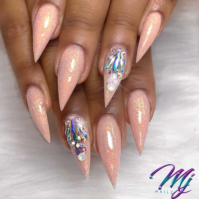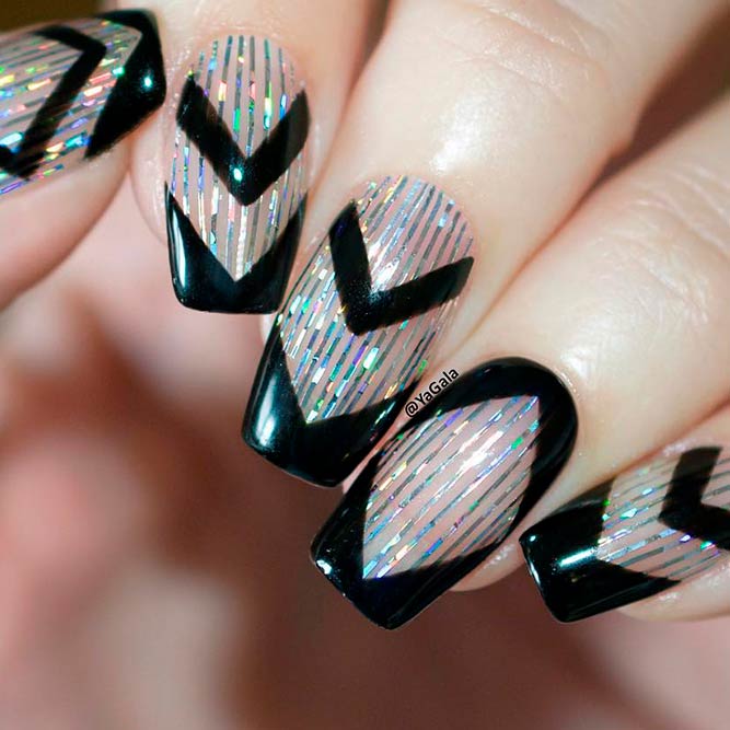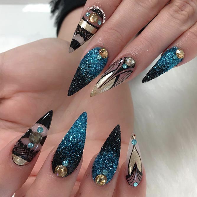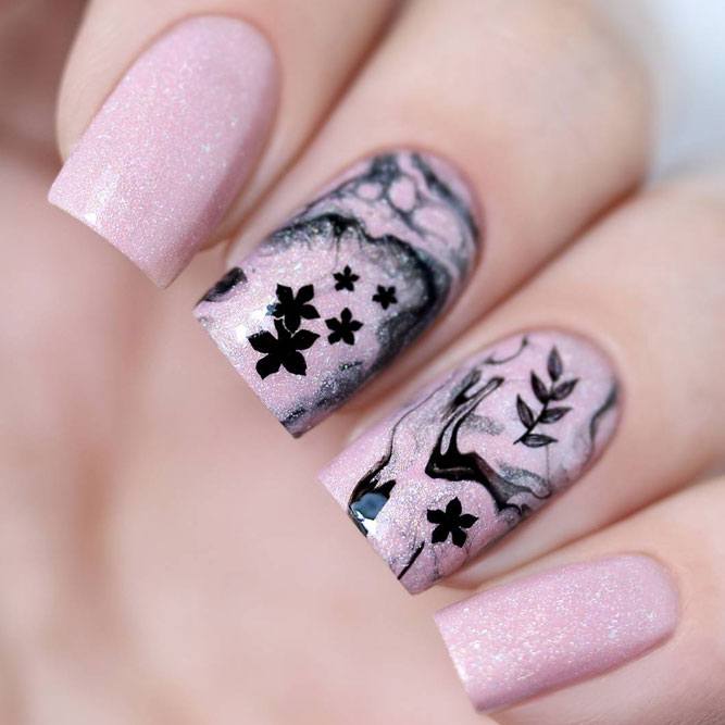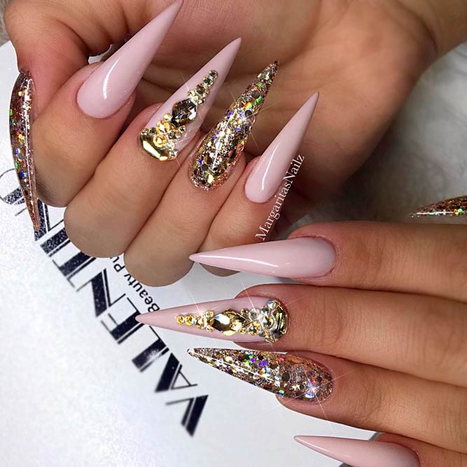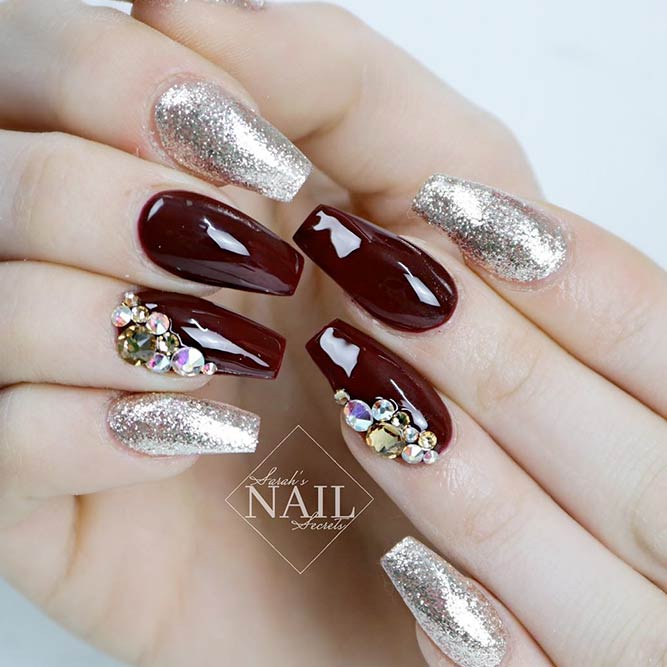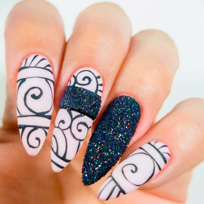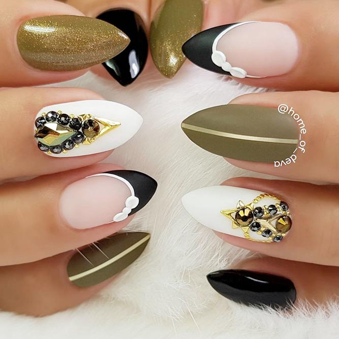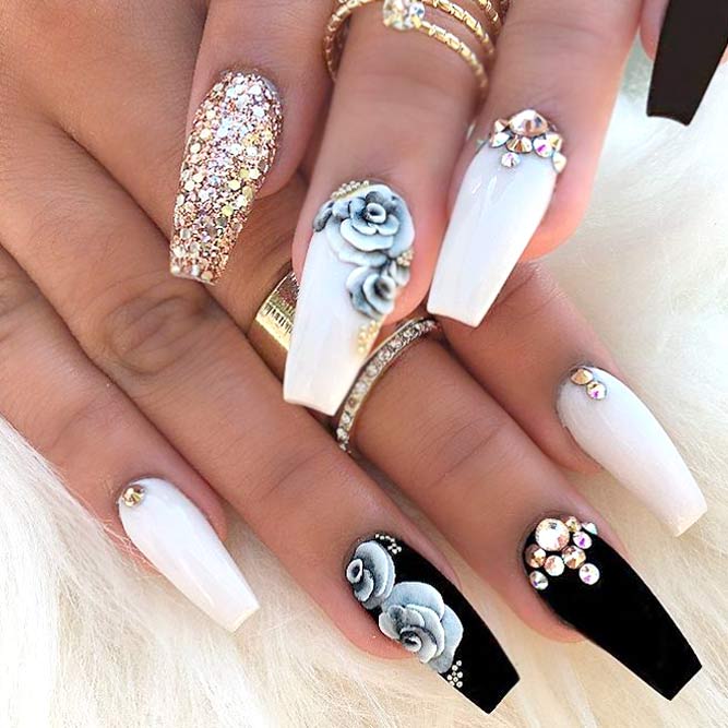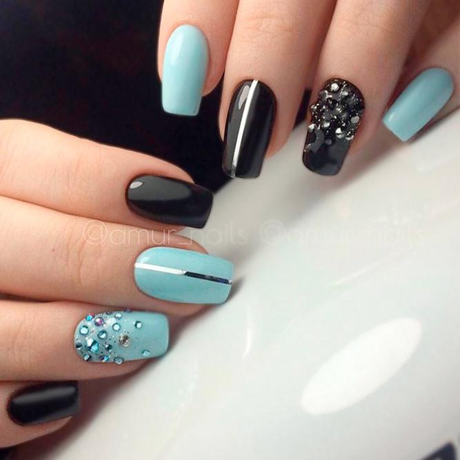 Les paillettes et les strass constituent un élément de décoration très brillant, attrayant et efficace. Utilisez de grosses pierres pour les appliquer sur l'annulaire sur toute sa surface et placez de petites paillettes sur les ongles restants. Si vous souhaitez créer l'image d'une princesse tendre et mignonne, optez pour une forme ovale de clous décorés en rose, avec l'ajout de strass sur le bord de l'annulaire et d'une pierre au sommet de chaque doigt. Pour les beautés audacieuses et extravagantes, les strass ou les paillettes en noir sont parfaits.