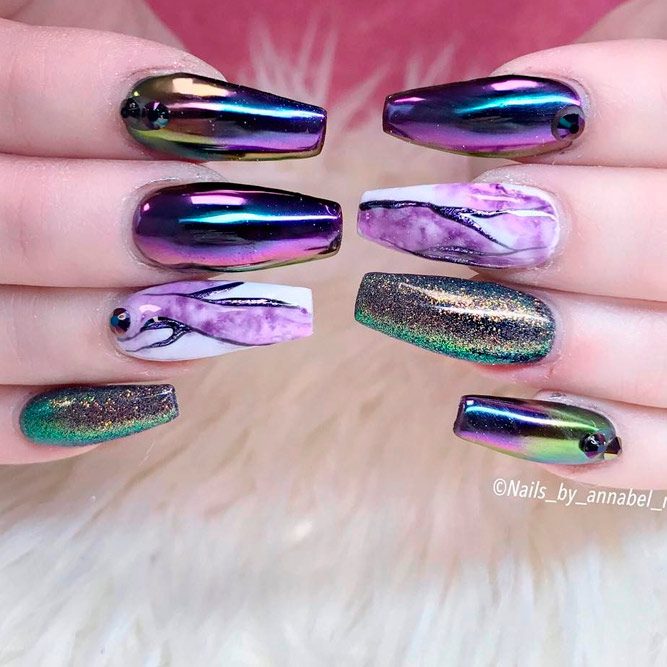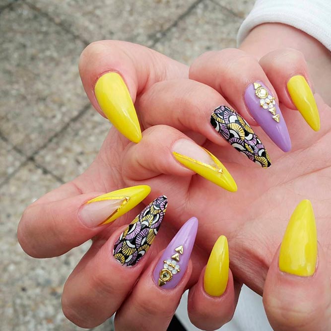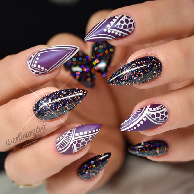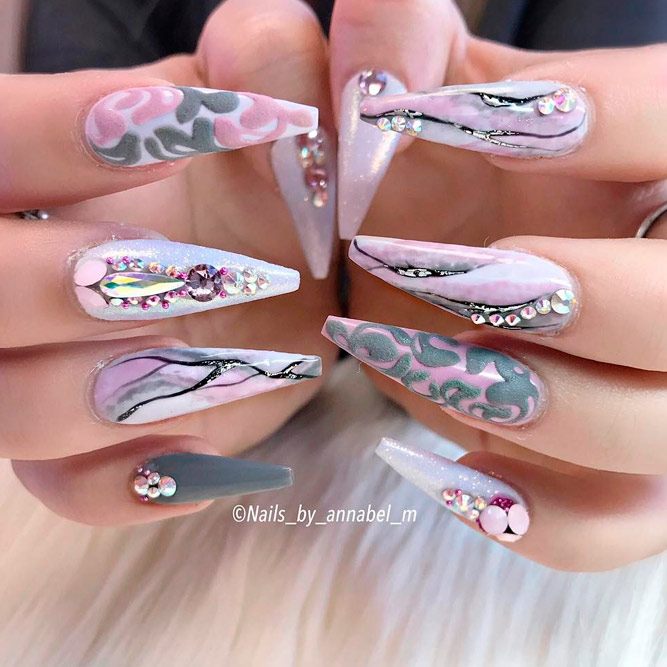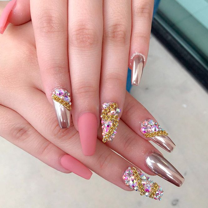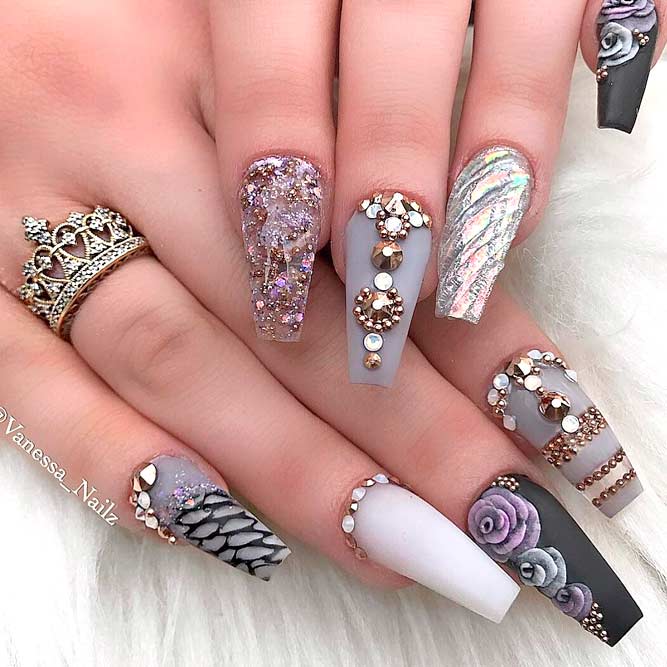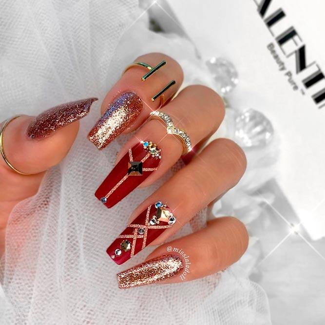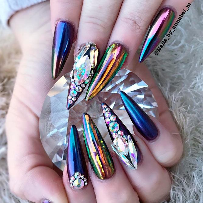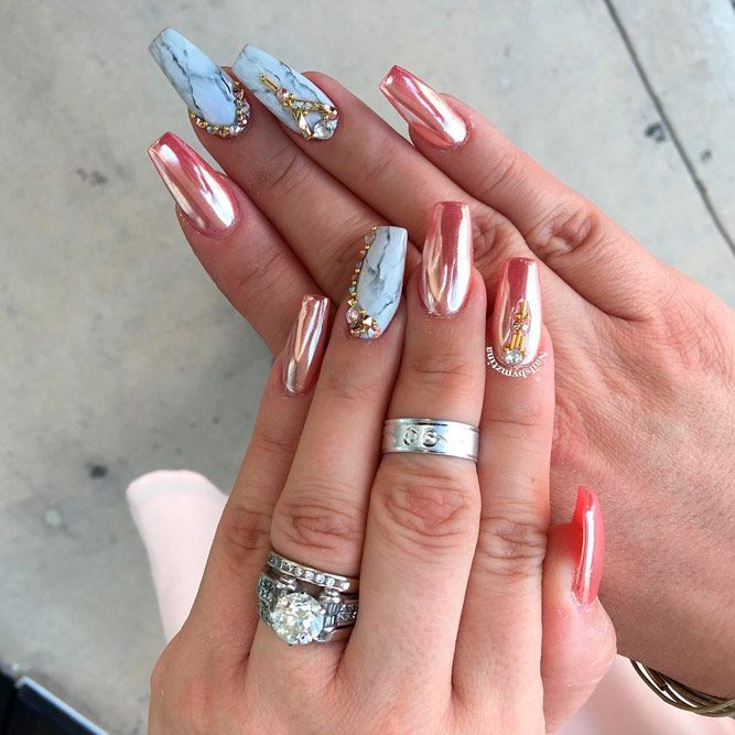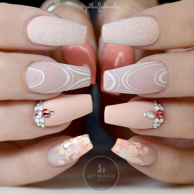 Les paillettes et les strass constituent un élément de décoration très brillant, attrayant et efficace. Utilisez de grosses pierres pour les appliquer sur l'annulaire sur toute sa surface et placez de petites paillettes sur les ongles restants. Si vous souhaitez créer l'image d'une princesse tendre et mignonne, optez pour une forme ovale de clous décorés en rose, avec l'ajout de strass sur le bord de l'annulaire et d'une pierre au sommet de chaque doigt. Pour les beautés audacieuses et extravagantes, les strass ou les paillettes en noir sont parfaits.