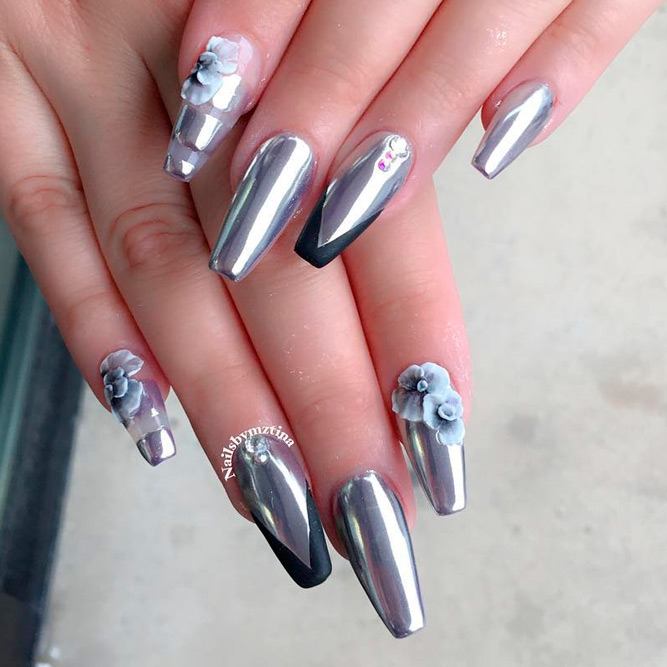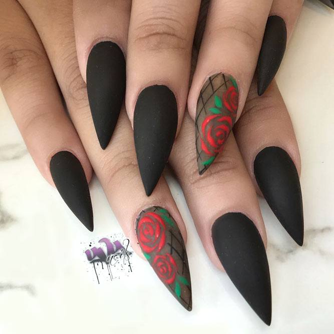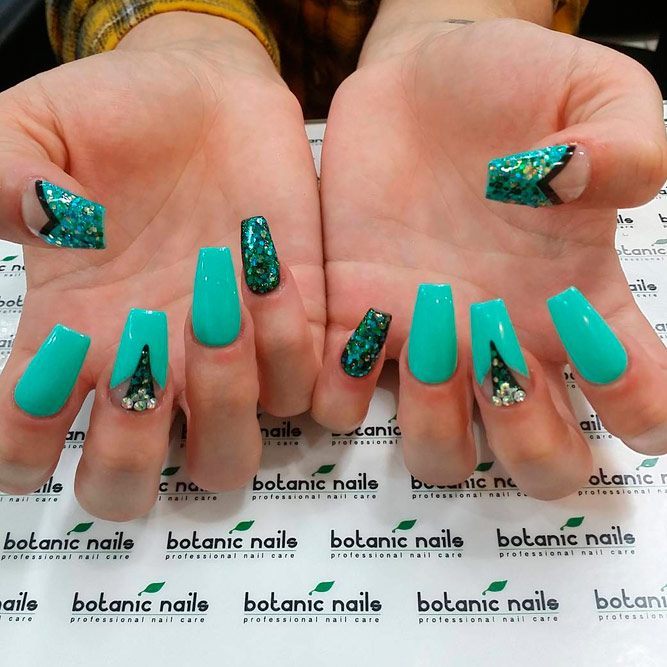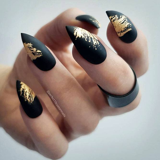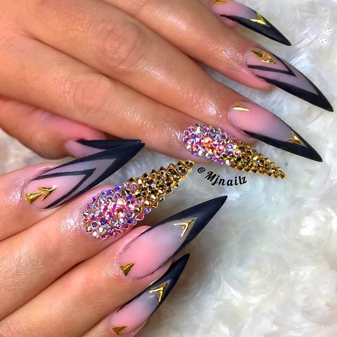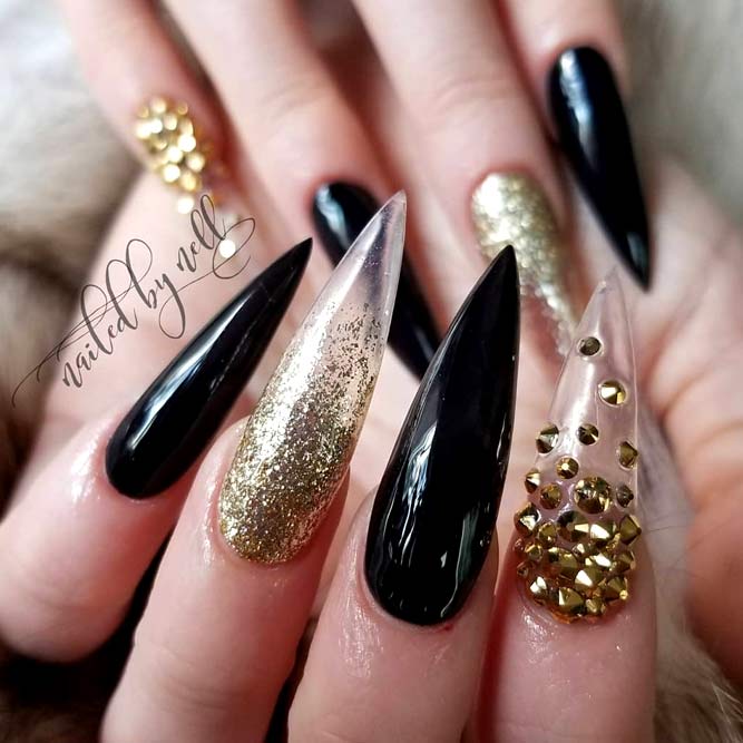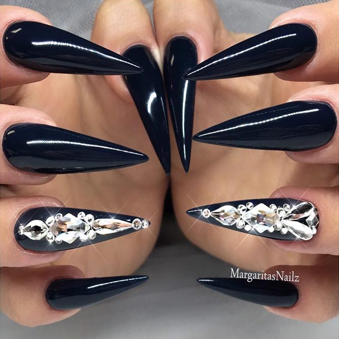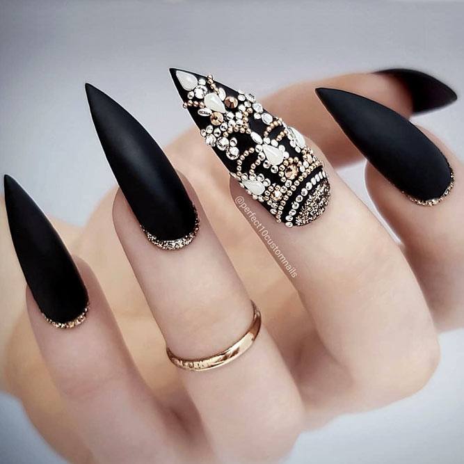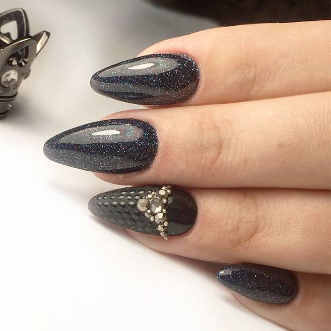 Pour les filles qui préfèrent l'extravagance, la meilleure option sera d'utiliser des ongles allongés à la mode en noir. Un tel revêtement est souhaitable pour se diversifier avec des strass décorés, des paillettes, des paillettes, des confettis. Mais une version noire unie a fière allure.
