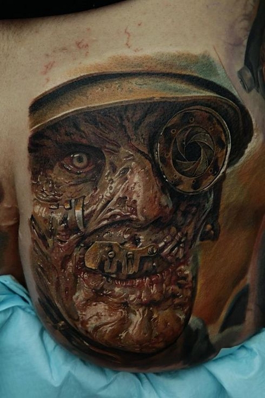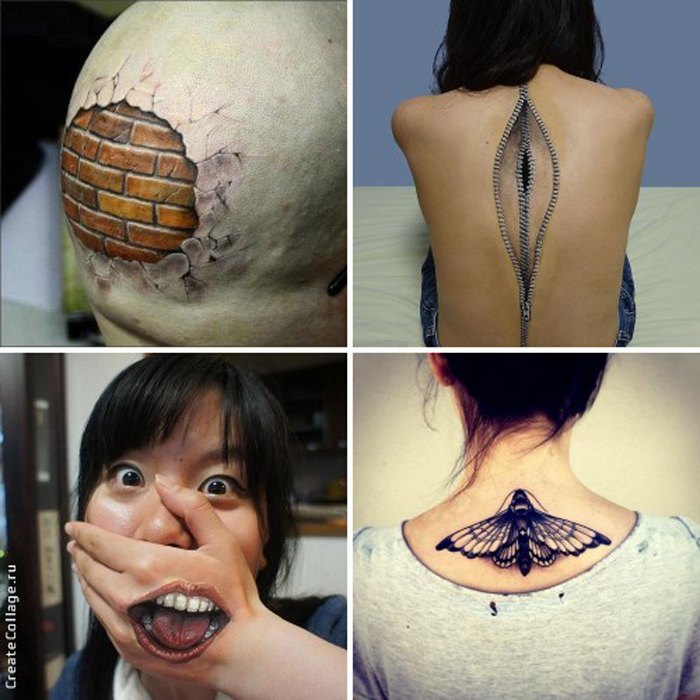 Images en trois dimensions - une technique qui attire beaucoup l'attention sur la conception réaliste, et peut facilement induire en erreur. La dynamique correctement transmise, la maîtrise de l’art du clair-obscur sont capables de reproduire des dessins étonnants. Par exemple, l’imitation de cavités dans le corps, les fermetures à glissière et le laçage, l’image des os nus, bien sûr, font sensation.