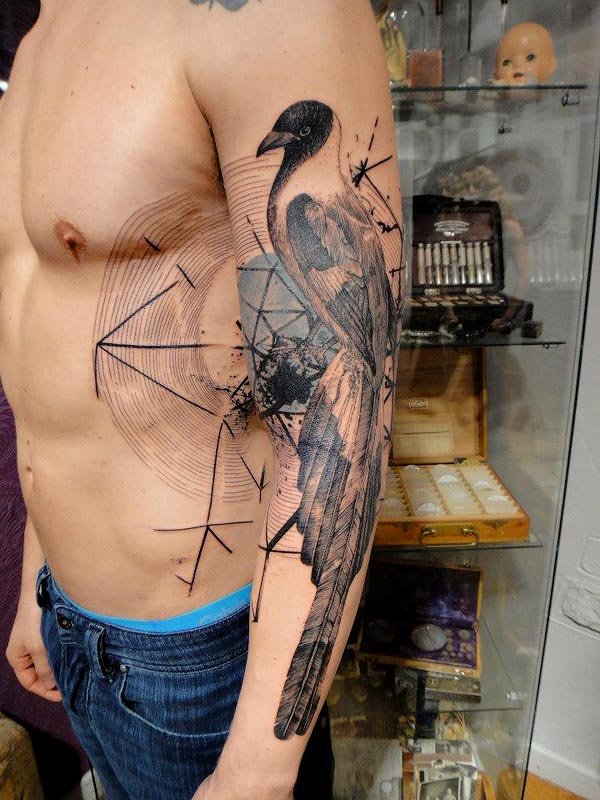 Très souvent, sur un corps masculin fort, des tatouages sont réalisés dans le style d'un croquis. Ce sont des lignes claires, des détails géométriques et une harmonie d'ombres. De telles images semblent très attrayantes. Par exemple, des dessins brillants avec des gouttes et des taches, réalisés à l'aide de la technique de l'aquarelle, ou des dessins originaux dans le cadre de formes géométriques semblent très inhabituels. Les dessins se déplaçant d'une partie du corps à une autre, tout en représentant une image, ne seront pas ignorés.