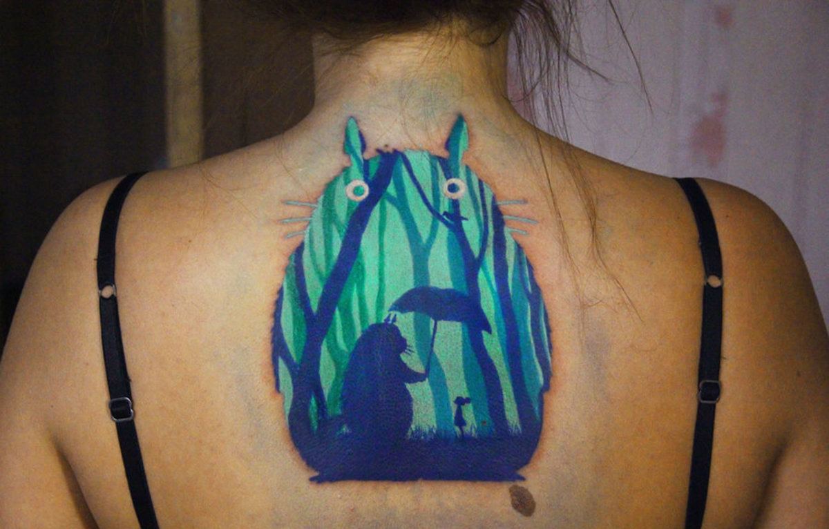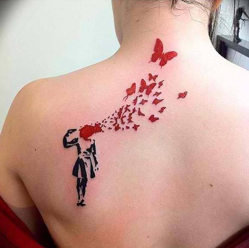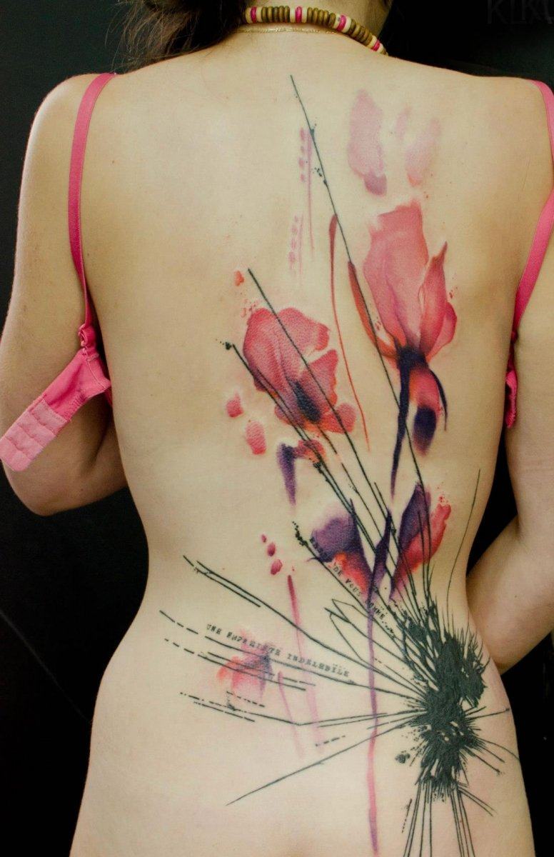 Lorsqu'ils choisissent un endroit pour appliquer un tatouage, ils prennent de plus en plus la décision de le représenter sur le dos. Et ce n’est pas une coïncidence, car sur cette partie du corps, vous pouvez dessiner à la fois des petits dessins et des images à grande échelle, car il y a des endroits où se promener. Très souvent, on peut voir à l'arrière des images spectaculaires, inhabituelles et intéressantes sous la forme de plantes situées sur toute la longueur de l'épine dorsale (épillets, conifères, feuillages, fleurs sauvages). Les aquarelles et les images géométriques sont très populaires, et il vaut la peine d'investir le caractère et l'ambiance du propriétaire. Par exemple, des tatouages tels que Peter Pan ou Alice, tombant d’une montagne de livres, l’esprit de la nature sous la forme d’une amulette personnelle, une araignée au centre du dos, descendant le long d’une toile d’araignée ou d’une éclipse phasée semblera très original.