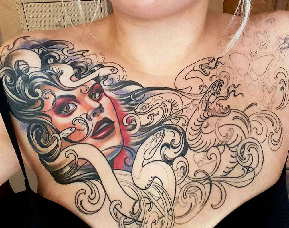 Le principal avantage d'un tatouage de couleur réside dans son accrochage et sa capacité à exprimer pleinement le sens et le caractère. Les couleurs vives et contrastées sont caractéristiques des personnalités audacieuses et extraordinaires à la disposition explosive et au point de vue optimiste de la vie. Les couleurs vives les plus appropriées dans la technique de l'aquarelle, du réalisme et de la polka trash. De manière inhabituelle et attrayante, une manche complètement bouchée ressemble à une fleur ou à d’autres éléments, une fleur lumineuse sur n’importe quelle partie du corps. Très souvent, il y a une fusion de styles dans un dessin pectoral très beau et dynamique. Les tatouages de couleur sont effectués à la fois par les hommes et les femmes.