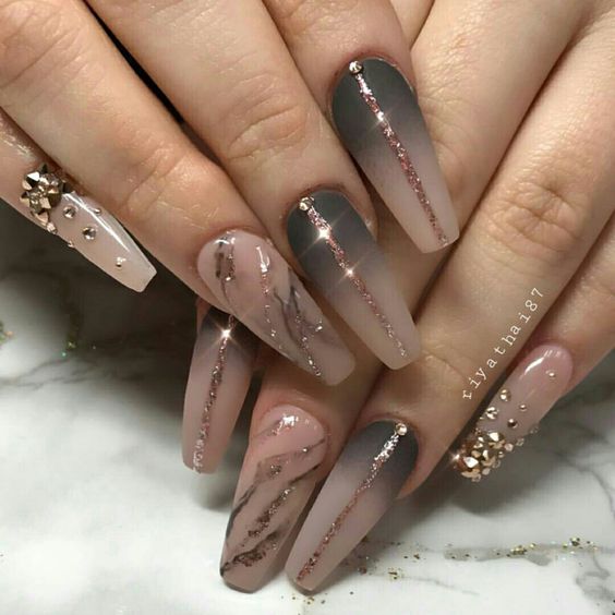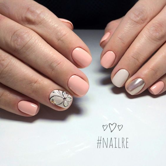 La manucure nude est une manucure dans laquelle toutes les couleurs sont en harmonie. Le design optimal et compatible avec le nu est donc ombre. Vous souhaitez obtenir une manucure douce et légère, puis optez pour une combinaison de vernis simples et blancs. Décidez d’être créatif et insolite - ajoutez du noir. Si vous partez en vacances, diluez l’ombre avec des étincelles. Une manucure a l’air très stylée lorsqu’une transition de couleur en douceur se produit non seulement dans un ongle, mais dans l’ensemble de la manucure. C'est-à-dire que nous recouvrons chaque ongle suivant avec des nuances plus saturées, nous commençons par les nus et devenons progressivement une nuance plus saturée selon vos goûts. En utilisant une variété de frictions, votre manucure nue prendra un look unique. Il existe aujourd'hui de nombreux types de vernis, mais le plus approprié pour notre manucure est la perle ou l'argent, ainsi que le chrome blanc. En utilisant ces frottements, vous obtenez des ongles en perles ou en miroir. Terminez votre chef-d'œuvre avec de légères impressions de strass ou de petites pierres. Un seul clou avec un motif délicat complétera le look à la mode.