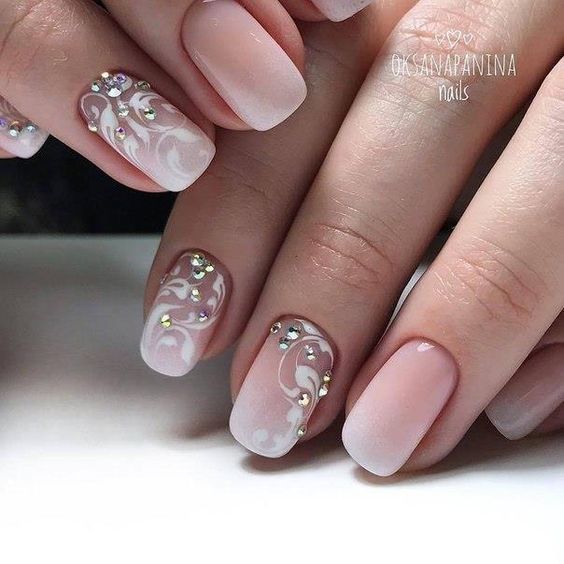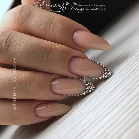 En utilisant cette année des strass dans une nouvelle manucure, vous obtiendrez un véritable chef-d’œuvre.Sur un fond doux et naturel, les cristaux de strass irisés sont fascinants et magiques. L'arrangement de strass est un vol de votre imagination. Ils peuvent être dispersés au hasard sur plusieurs ongles. Vous pouvez poser soigneusement la cuticule ou l’ongle entier, en décrivant une sorte de forme géométrique ou une fleur. Les paillettes en manucure nude sont très élégantes. Imaginez une veste française nue avec des brillants. Il en résulte un look élégant et gracieux de vos ongles, qui viendra compléter votre image impeccable. Vous voulez avoir l'air piquant et ajouter mystérieusement des étincelles à vos dessins. Il peut s'agir de géométrie et de motifs floraux délicats. Mais comment pourrait-il être sans classique - une veste classique. Aujourd'hui, la veste classique s'est transformée en naturel. Le sourire blanc classique a été remplacé par des tons chair plus doux et naturels. Cette année, une base transparente est très importante, sur laquelle est appliquée une finition française blanche-grise ou rose pâle proche du naturel. Cette option de manucure est très élégante.
