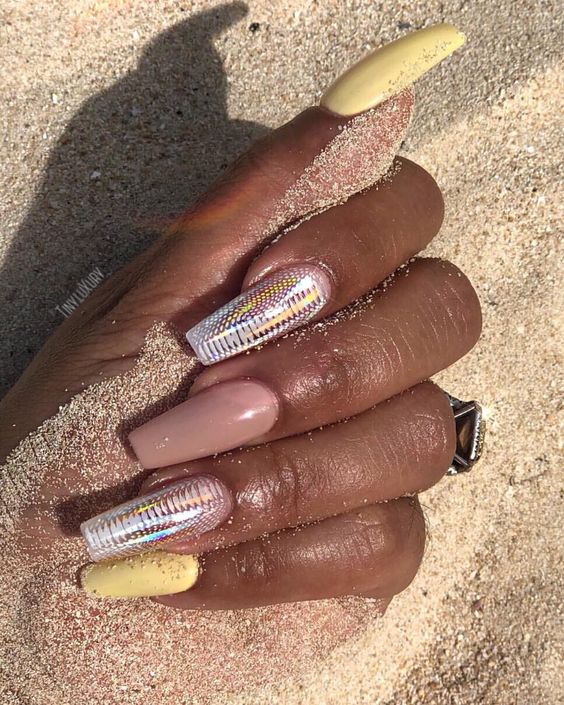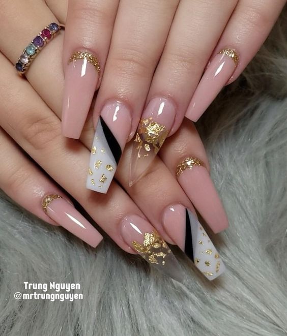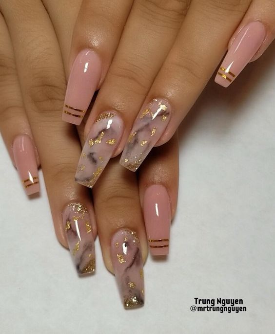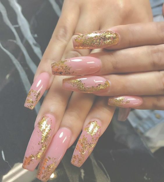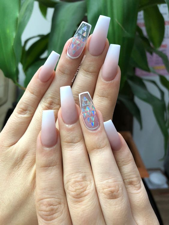 La manucure nue allonge visuellement vos ongles, ce qui permet aux ongles longs de paraître encore plus longs. Une technique utilisant des vernis transparents est très populaire en manucure nue. Vos ongles seront impeccables et naturels. Et si vous ajoutez un peu de strass, de cailloux ou d’étincelles, vous aurez une option festive. Les dessins ne seront pas superflus - ce peut être une géométrie à la mode cette année, des images de feuilles ou de fleurs.
