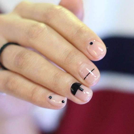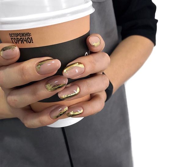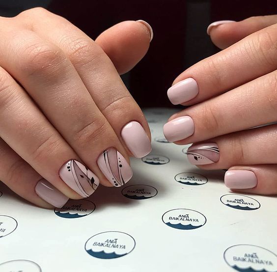 L'utilisation de papier d'aluminium, de poudre acrylique, de toutes sortes d'étincelles, de pierres et de strass n'est pas superflue dans l'exécution d'une manucure, mais en utilisant ces décorations, il ne faut pas oublier que la manucure nue est un phénomène naturel. Vous ne pouvez pas en faire trop avec des bijoux. L'option la plus optimale dans une manucure nue est le minimalisme. Le minimalisme est toujours à la mode. Après avoir complété vos ongles avec un minimum de bijoux, vous recevrez une manucure unique, élégante et à la mode. Un motif géométrique formé de fines lignes ou d'une simple ligne au milieu d'un ongle peut servir d'image, de fleur ou de feuille délicate. En 20269, les petits points ou les traits chaotiques sont pertinents. De petites taches d'étincelles, de papier d'aluminium ou de ruban adhésif brillant auront fière allure, mais vous devez être très prudent avec cela, car le minimalisme implique peu.