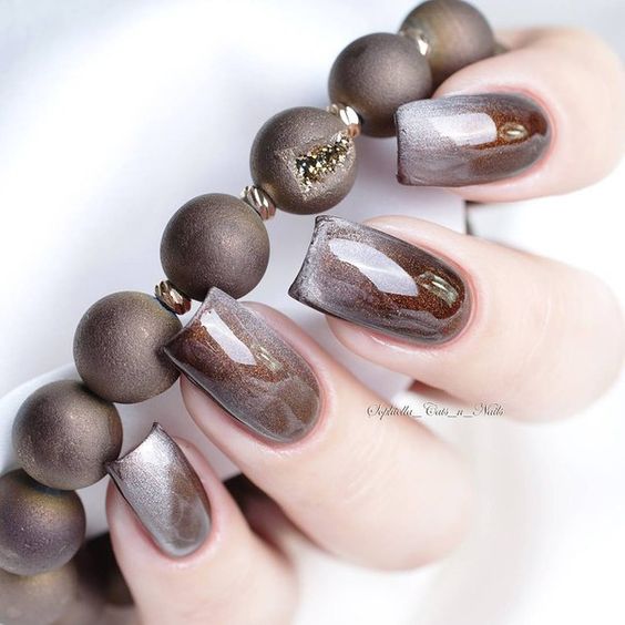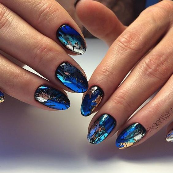 La couleur bronze, argent, or est sans aucun doute le choix le plus réussi pour l'hiver 2026. Une manucure dans la technique du métal est tout simplement étonnante par sa beauté et son originalité. Avec une telle manucure, elle se démarque simplement des autres, en mettant l'accent sur l'individualité et le style. Cette année, les revêtements holographiques spectaculaires de tons bleu-vert, saphir et olive sont très populaires.