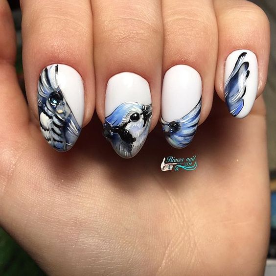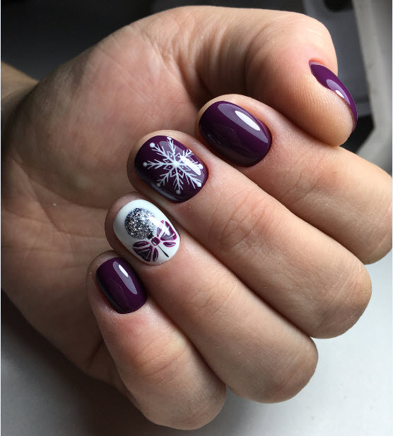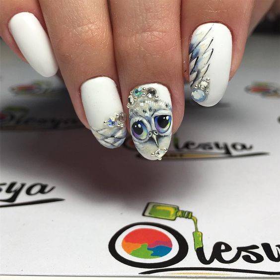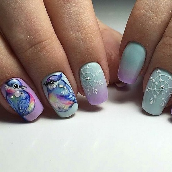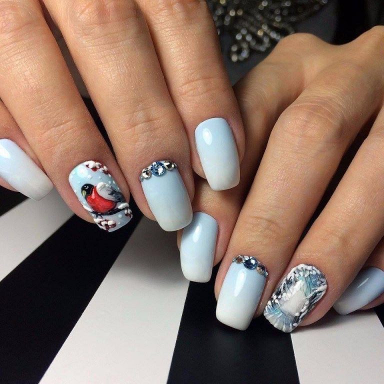 Comme mentionné ci-dessus, les dessins sur le thème de l'hiver les plus populaires sont des flocons de neige délicats et mignons. Une autre option très pertinente sera les images d'oiseaux. Les symboles du Nouvel An sont également à la mode aujourd'hui. Ce sont: des guirlandes de fête, des jouets de Noël, des guirlandes. Un accent délicat sur les thèmes de l’hiver permettra de créer des motifs sous la forme d’une toile d’araignée, de brindilles, de glaçons et de courgettes glacées. Cette année, pendant la saison froide, vous ne pouvez pas vous passer de motifs ethniques vifs, qui sont très liés à l’hiver, au confort de la maison et aux vacances en famille.