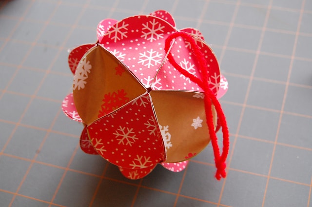 Nous plions six cercles en deux et les collons ensemble. Nous attachons un fil dense ou une ficelle à la base afin que le jouet puisse être suspendu à un arbre de Noël.